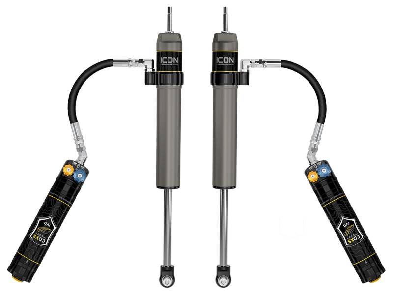 ICON Vehicle Specific (V.S.) 2.5 Aluminum Series shocks are designed and built to give your vehicle outstanding performance off-road and a smooth ride on the street. These shocks are configured specifically for each application in both length and damping tune. Like all ICON'S Shock Absorbers, V.S. 2.5 Aluminum Series shocks are fully rebuildable and re-tunable. For piggyback and specific remote reservoir applications, ICON'S unique use of a 6061-billet aluminum manifold a few inches below the top cap of the shock creates an internal Bump Zone that when used creates an additional 20% of damping force. This additional force helps prevent harsh bottom outs and controls the suspension when compressing at high velocity. Compression Damping Dual Speed (CDXS) valves are included for precisely dialing in your suspension performance. CDXS controls fluid flow under compression, with independent adjustability of high speed and low speed compression force. 10 discreet detented settings for both low and high-speed adjustment knobs allow separate adjustments for handling response and overall aggressiveness.