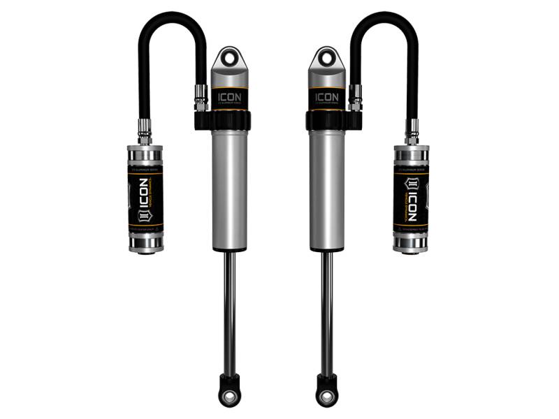 ICON Vehicle Specific (V.S.) 2.5 Aluminum Series shocks are designed and built to give your vehicle outstanding performance off-road and a smooth ride on the street. These shocks are configured specifically for each application in both length and damping tune. Like all ICON'S Shock Absorbers, V.S. 2.5 Aluminum Series shocks are 100% rebuildable and 100% revalveable. For piggyback and specific remote reservoir applications, ICON'S unique use of a 6061 billet aluminum manifold a few inches below the top cap of the shock creates an internal Bump Zone that when used creates an additional 20% of damping force. This additional force helps prevent harsh bottom outs and controls the suspension when compressing at high velocity. If you are looking for a more user defined tune, consider looking into the Compression Damping Control Valve (CDCV) or the Omega Series bypass shocks.