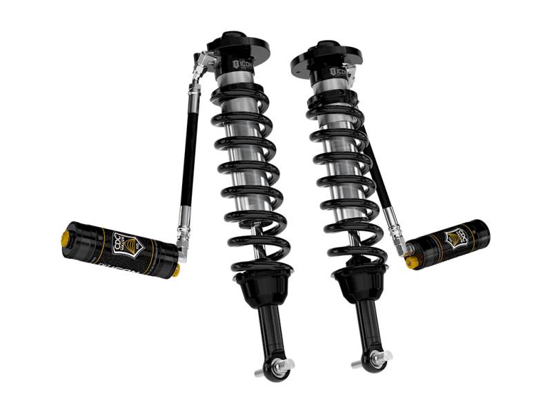 The ICON Vehicle Dynamics V.S. Series 2.5” remote reservoir coilover shocks w/ CDCV are an incredible upgrade for the front end of the 2021-2024 Ford F-150 4WD truck. ICON’s Vehicle-specific valving provides a sport tuned feel on and off-road while offering 0-2.75” of lift height adjustability for use of larger, more aggressive wheel and tire combinations. ICON's larger 2.5” shock body and increased piston area over stock components provides improved damping ability and outstanding ride characteristics across varying types of terrain. Remote reservoirs ensure optimum performance by increasing the duration of consistent damping regardless of situation, keeping the shocks at a cooler operating temperature during heavy use. The ICON CDC Valve upgrade is included for those desiring an easy way to tune the ride externally with 10 settings from soft to hard. When paired with ICON rear 2.0 Aluminum Series or 2.5 Aluminum Series shocks, vehicle control will be balanced front to rear resulting in the best overall driving experience for your 2021-2024 F-150 4WD. The ICON Vehicle Dynamics V.S. Series 2.5” remote reservoir coilover shocks w/ CDCV are an incredible upgrade for the front end of the 2021-UP Ford F-150 4WD truck. ICON’s Vehicle-specific valving provides a sport tuned feel on and off-road while offering 0-2.75” of lift height adjustability for use of larger, more aggressive wheel and tire combinations. ICON's larger 2.5” shock body and increased piston area over stock components provides improved damping ability and outstanding ride characteristics across varying types of terrain. Remote reservoirs ensure optimum performance by increasing the duration of consistent damping regardless of situation, keeping the shocks at a cooler operating temperature during heavy use. The ICON CDC Valve upgrade is included for those desiring an easy way to tune the ride externally with 10 settings from soft to hard. When paired with ICON rear 2.0 Aluminum Series or 2.5 Aluminum Series shocks, vehicle control will be balanced front to rear resulting in the best overall driving experience for your 2021-UP F-150 4WD.