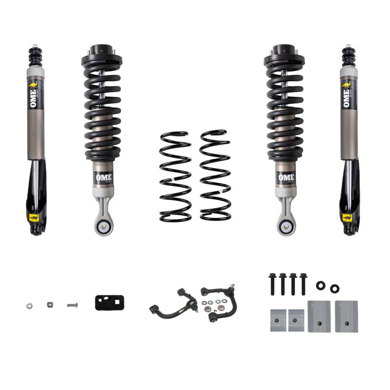 Old Man Emu offers a range of tuned and matched integrated suspension kits to ensure the right suspension is selected for how the vehicle is outfitted and the conditions it will encounter. Old Man Emu suspension systems are designed to enhance ride quality, ride control, load-carrying capacity, and ride height. When building an off-road vehicle, it's best to notate the heavy parts that you plan to add. Heavy components will slowly begin to compress your suspension which results in vehicle sag. Choosing an Old Man Emu integrated suspension kit will avoid sag and ride discomfort as our engineers have tuned and matched suspension components for an range of different weights. This suspension lift kit comes with Old Man Emu MT64 shocks. The MT64 shocks are engineered to handle every challenge, from demanding overlanding trips to the daily commute and every custom build in between, the MT64's huge 2.8in aluminum body and vehicle-specific damping ensure optimal performance across any terrain. This suspension lift kit is tuned and matched for the Toyota Tundra to provide 3in of lift in the front, with a weight of 220-330lbs and provide 2in of lift in the rear with a weight of 440lbs. This kit includes upgraded upper control arms.