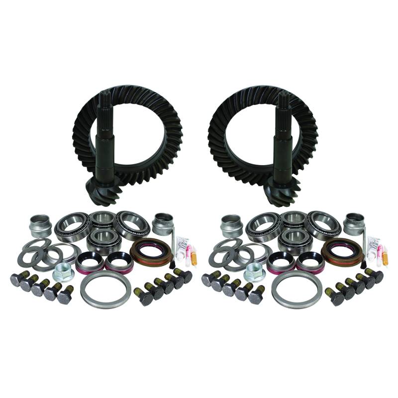 Yukon Gear Kits combine all the parts you need for your re-gear project. It delivers front and rear ring and pinion gear sets and the proper Yukon Master Overhaul Kits in one single part number. Yukon Gear & Axle high-performance ring and pinion gear sets are the benchmark of quality in the automotive gear industry. Yukon engineers use state-of-the art design, advanced heat-treating techniques, and leading-edge quality testing processes to ensure the structure and surface finish meet exacting specifications and quality standards. Yukon offers its Y.E.S. Plan, a lifetime, comprehensive, no-questions-asked protection plan covering your gear set kit for as long as you own your vehicle. If you are thinking about increasing tire size, looking for more towing power, enhancing off-road prowess, or just replacing worn gears, these convenient combo kits have everything your vehicle will need. Yukon gear packages provide an easy way to re-gear a four wheel drive vehicle with one simple part number.