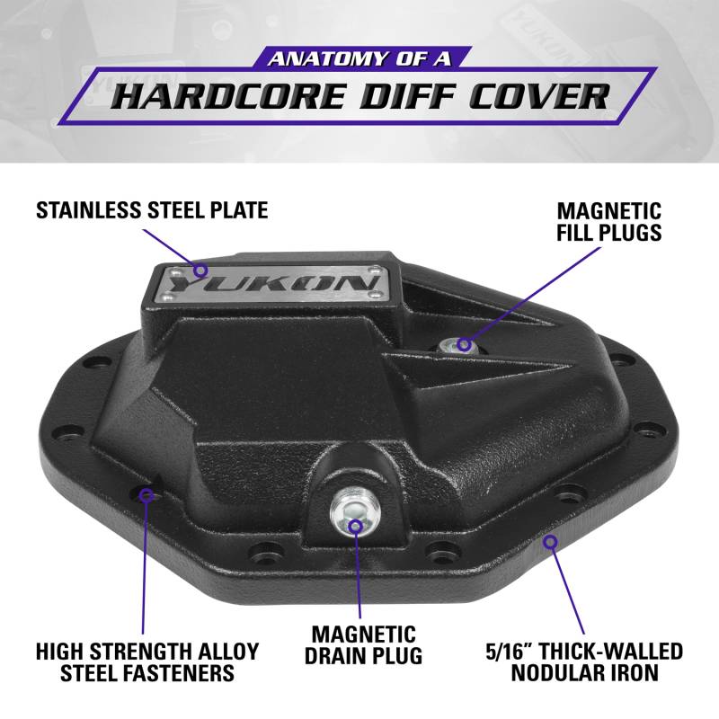 Yukon Hardcore Diff Covers are constructed from thick-walled, high-strength nodular steel to protect lockers, gears and axles from the most extreme hits in off road driving. They also increase the structural rigidity of the differential, reducing deflection under high-torque situations that can put severe loads on vital internal parts. Yukon Hardcore Diff Covers feature a durable powder coat finish and high strength steel fasteners for easy bolt-on installation. It's no secret that the underside of your rig can take a beating. Remember your diff! It's the lowest hanging fruit and very susceptible to damage… crack or break it and you're done for the day. Upgrade to a Yukon Hardcore Diff Cover and enjoy more peace of mind on the trail. Yukon Hardcore Diff Covers are constructed from thick-walled, high-strength nodular steel to protect lockers, gears and axles from the most extreme hits in off road driving. They also increase the structural rigidity of the differential, reducing deflection under high-torque situations that can put severe loads on vital internal parts. Yukon Hardcore Diff Covers feature a durable powder coat finish and high strength steel fasteners for easy bolt-on installation. It’s no secret that the underside of your rig can take a beating. Remember your diff! It’s the lowest hanging fruit and very susceptible to damage… crack or break it and you’re done for the day. Upgrade to a Yukon Hardcore Diff Cover and enjoy more peace of mind on the trail.