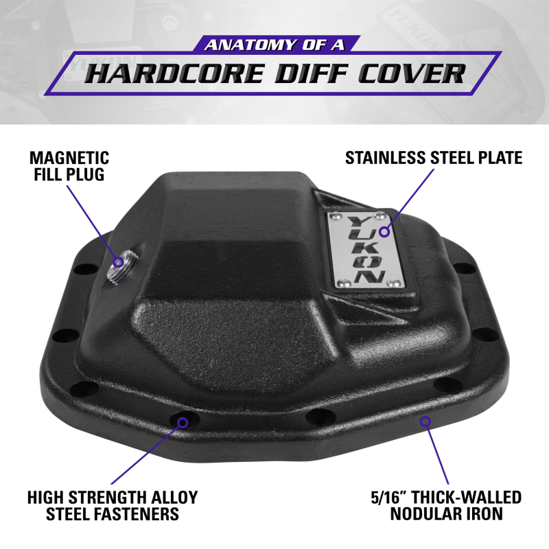 Yukon Hardcore Diff Covers are constructed from thick-walled, high-strength nodular steel to protect lockers, gears and axles from the most extreme hits in off road driving. They also increase the structural rigidity of the differential, reducing deflection under high-torque situations that can put severe loads on vital internal parts. Yukon Hardcore Diff Covers feature a durable powder coat finish and high strength steel fasteners for easy bolt-on installation. It's no secret that the underside of your rig can take a beating. Remember your diff! It's the lowest hanging fruit and very susceptible to damage… crack or break it and you're done for the day. Upgrade to a Yukon Hardcore Diff Cover and enjoy more peace of mind on the trail. Yukon Hardcore Diff Covers are constructed from thick-walled, high-strength nodular steel to protect lockers, gears and axles from the most extreme hits in off road driving. They also increase the structural rigidity of the differential, reducing deflection under high-torque situations that can put severe loads on vital internal parts. Yukon Hardcore Diff Covers feature a durable powder coat finish and high strength steel fasteners for easy bolt-on installation. It’s no secret that the underside of your rig can take a beating. Remember your diff! It’s the lowest hanging fruit and very susceptible to damage… crack or break it and you’re done for the day. Upgrade to a Yukon Hardcore Diff Cover and enjoy more peace of mind on the trail.
