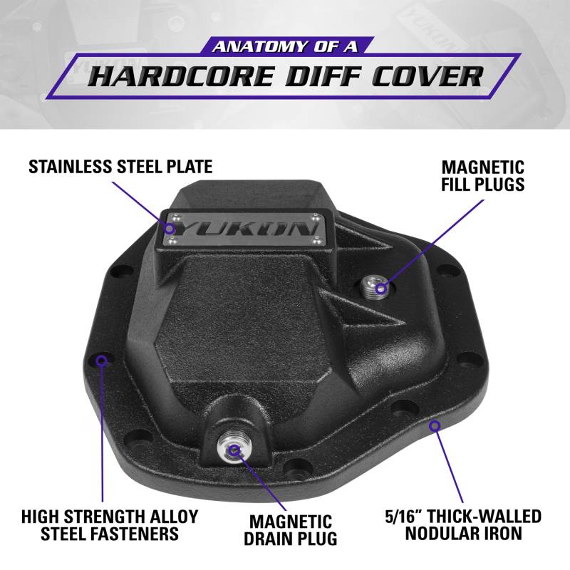 Yukon Hardcore Diff Covers are constructed from thick-walled, high-strength nodular steel to protect lockers, gears and axles from the most extreme hits in off road driving. They also increase the structural rigidity of the differential, reducing deflection under high-torque situations that can put severe loads on vital internal parts. Yukon Hardcore Diff Covers feature a durable powder coat finish and high strength steel fasteners for easy bolt-on installation. It's no secret that the underside of your rig can take a beating. Remember your diff! It's the lowest hanging fruit and very susceptible to damage… crack or break it and you're done for the day. Upgrade to a Yukon Hardcore Diff Cover and enjoy more peace of mind on the trail. Yukon Hardcore Diff Covers are constructed from thick-walled, high-strength nodular steel to protect lockers, gears and axles from the most extreme hits in off road driving. They also increase the structural rigidity of the differential, reducing deflection under high-torque situations that can put severe loads on vital internal parts. Yukon Hardcore Diff Covers feature a durable powder coat finish and high strength steel fasteners for easy bolt-on installation. It’s no secret that the underside of your rig can take a beating. Remember your diff! It’s the lowest hanging fruit and very susceptible to damage… crack or break it and you’re done for the day. Upgrade to a Yukon Hardcore Diff Cover and enjoy more peace of mind on the trail.