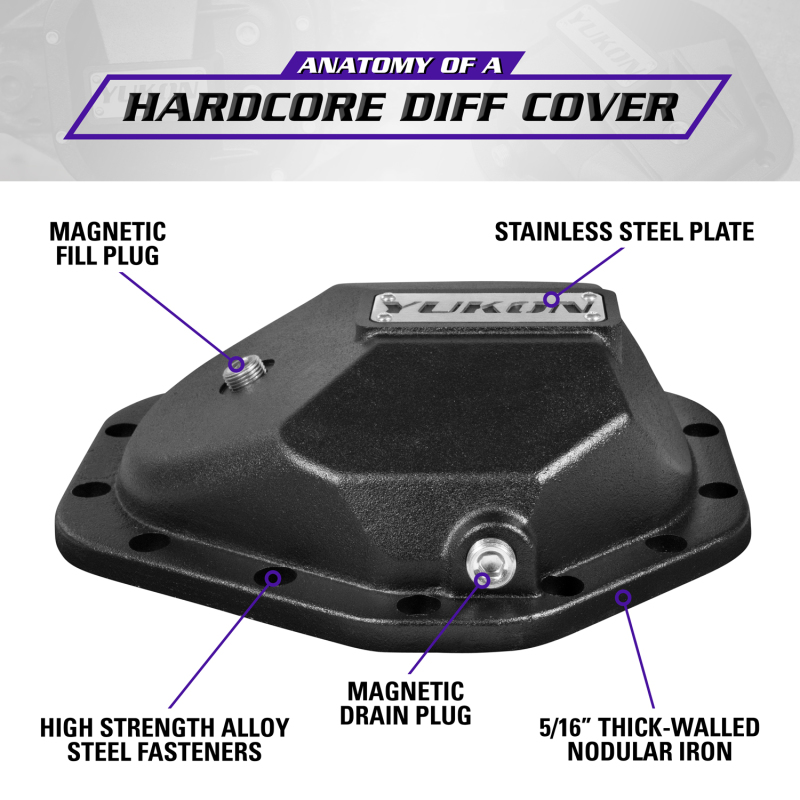 Yukon Hardcore Diff Covers are constructed from thick-walled, high-strength nodular steel to protect lockers, gears and axles from the most extreme hits in off road driving. They also increase the structural rigidity of the differential, reducing deflection under high-torque situations that can put severe loads on vital internal parts. Yukon Hardcore Diff Covers feature a durable powder coat finish and high strength steel fasteners for easy bolt-on installation. It's no secret that the underside of your rig can take a beating. Remember your diff! It's the lowest hanging fruit and very susceptible to damage… crack or break it and you're done for the day. Upgrade to a Yukon Hardcore Diff Cover and enjoy more peace of mind on the trail. Yukon Hardcore Diff Covers are constructed from thick-walled, high-strength nodular steel to protect lockers, gears and axles from the most extreme hits in off road driving. They also increase the structural rigidity of the differential, reducing deflection under high-torque situations that can put severe loads on vital internal parts. Yukon Hardcore Diff Covers feature a durable powder coat finish and high strength steel fasteners for easy bolt-on installation. It’s no secret that the underside of your rig can take a beating. Remember your diff! It’s the lowest hanging fruit and very susceptible to damage… crack or break it and you’re done for the day. Upgrade to a Yukon Hardcore Diff Cover and enjoy more peace of mind on the trail.