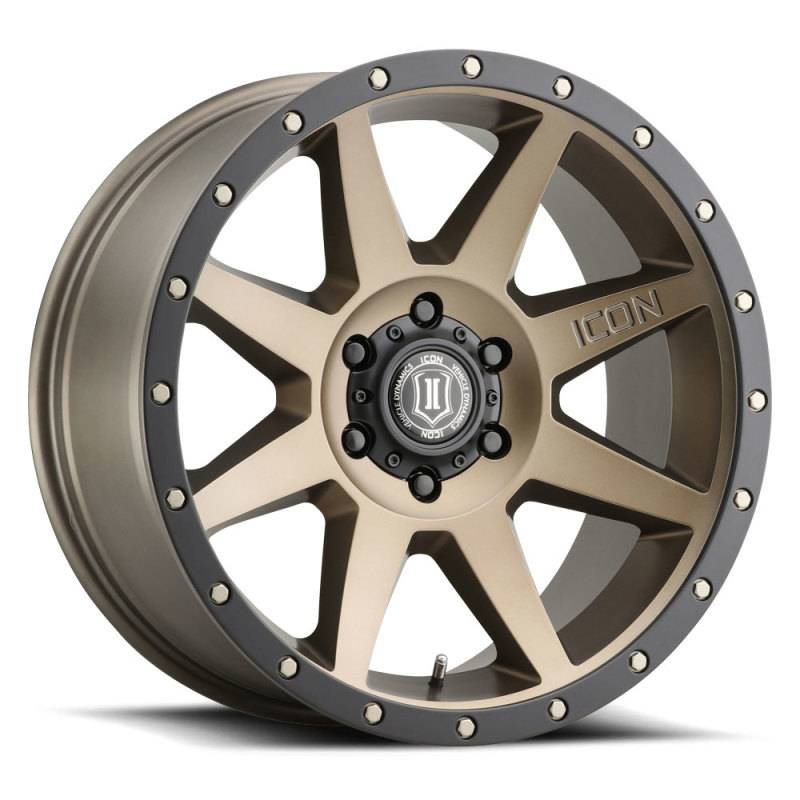 Constructed using a high-strength aluminum alloy the 20” 'Rebound' yields a 2,750 pound load rating that will withstand daily driven use, tow/haul duty, and spirited off-road adventures! These wheels are available in our signature Bronze, Satin Black or Titanium finishes and maintain ICON Alloys’ commitment to producing wheels that deliver on fit, style, and strength. Constructed using a high-strength aluminum alloy the 20” 'Rebound' yields a 2,750 pound load rating that will withstand daily driven use, tow/haul duty, and spirited off-road adventures! These wheels are available in our signature Bronze, Satin Black, Double Black, or Titanium finishes and maintain ICON Alloys’ commitment to producing wheels that deliver on fit, style, and strength. ICON Alloys is pleased to announce the arrival of new 20" sizes of our best-selling 'Rebound' wheel designed for today’s most popular 5-lug and 6-lug applications. Combining sharp lines, a concave spoke design, and color-matched rock ring bolts the new 20x9 ‘Rebound’ has a style that is anything but ordinary. These new wheels not only enhance the appearance of the most common vehicles, but also improve function with "ICON-optimized" backspacing that provides better wheel fitment, maximized caliper clearance, reduced scrub radius, and unhindered suspension travel.