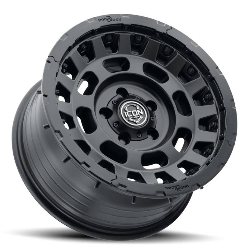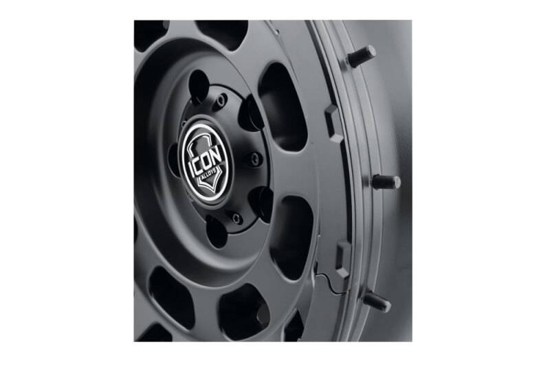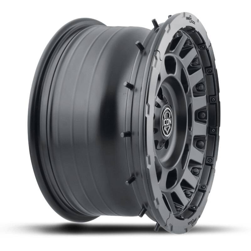 Any hardcore off-road enthusiast knows the numerous benefits that lower tire pressures offer such as improved ride quality and a larger contact patch for increased traction. However, low pressures also increase the risk of de-beading the tire during extreme side loads or aggressive driving. While traditional bead lock wheels address this issue by clamping the tire’s bead, they also need frequent maintenance, require specialty tools/parts, increase rotational mass, and are NOT legal for on-road use. During an accelerated R&D process ICON engineers subjected the InnerLock technology to thousands of miles of real-world abuse throughout harsh and unforgiving environments. After on-vehicle testing was concluded, wheels were sent to an independent contractor for precise lab testing, specifically the FMVSS No.139 Tire Bead Unseat Resistance Test (modified to 10 psi). Results from multiple tests validated the effectiveness of ICON’s InnerLock technology by exceeding the mechanical limits of the machine (over 7600lbs load) without ever de-beading the tire. Staying true to the ICON Alloys approach, the Hammer PRO has been engineered to maximize caliper clearance and optimize wheel position for un-hindered suspension travel and steering function. Backspace and wheel offset dimensions have been strategically developed to reduce scrub radius, improving all-around handling and ride quality. The Hammer PRO has also been strength tested to yield an incredible 3,650lb load rating - making it one of the strongest wheel options on the market. With build features such as these, it's clear that a set of ICON Alloys Hammer PRO wheels is the perfect complement to any truck, Jeep, or SUV. The ICON Alloys Hammer PRO with patented InnerLock technology offers the best of both worlds by using a robust bead retention system to keep the tire bead secured to the wheel while also being fully DOT compliant. This provides confidence in knowing that your wheels are prepared to tackle whatever situation you encounter - on or off the beaten path. InnerLock is ready for any type of terrain and every single adventure. The included high-grade aluminum, removable, and replaceable HALO Wheel Armor keeps the wheel looking new by protecting the Hammer PRO from trail rash. This HALO Wheel Armor is replaceable in 90° segments so individual sections can be changed if only a portion of the ring becomes damaged. Beyond superior form and function the HALO Wheel Armor can be easily customized to match your style for a truly unique wheel experience.