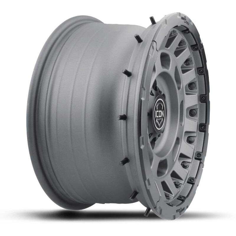 Any hardcore off-road enthusiast knows the numerous benefits that lower tire pressures offer such as improved ride quality and a larger contact patch for increased traction. However, low pressures also increase the risk of de-beading the tire during extreme side loads or aggressive driving. While traditional bead lock wheels address this issue by clamping the tire’s bead, they also need frequent maintenance, require specialty tools/parts, increase rotational mass, and are NOT legal for on-road use. During an accelerated R&D process ICON engineers subjected the InnerLock technology to thousands of miles of real-world abuse throughout harsh and unforgiving environments. After on-vehicle testing was concluded, wheels were sent to an independent contractor for precise lab testing, specifically the FMVSS No.139 Tire Bead Unseat Resistance Test (modified to 10 psi). Results from multiple tests validated the effectiveness of ICON’s InnerLock technology by exceeding the mechanical limits of the machine (over 7600lbs load) without ever de-beading the tire. Staying true to the ICON Alloys approach, the Hammer PRO has been engineered to maximize caliper clearance and optimize wheel position for un-hindered suspension travel and steering function. Backspace and wheel offset dimensions have been strategically developed to reduce scrub radius, improving all-around handling and ride quality. The Hammer PRO has also been strength tested to yield an incredible 3,650lb load rating - making it one of the strongest wheel options on the market. With build features such as these, it's clear that a set of ICON Alloys Hammer PRO wheels is the perfect complement to any truck, Jeep, or SUV. The ICON Alloys Hammer PRO with patented InnerLock technology offers the best of both worlds by using a robust bead retention system to keep the tire bead secured to the wheel while also being fully DOT compliant. This provides confidence in knowing that your wheels are prepared to tackle whatever situation you encounter - on or off the beaten path. InnerLock is ready for any type of terrain and every single adventure. The included high-grade aluminum, removable, and replaceable HALO Wheel Armor keeps the wheel looking new by protecting the Hammer PRO from trail rash. This HALO Wheel Armor is replaceable in 90° segments so individual sections can be changed if only a portion of the ring becomes damaged. Beyond superior form and function the HALO Wheel Armor can be easily customized to match your style for a truly unique wheel experience.