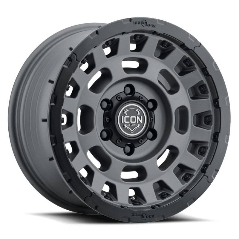 Any hardcore off-road enthusiast knows the numerous benefits that lower tire pressures offer such as improved ride quality and a larger contact patch for increased traction. However, low pressures also increase the risk of de-beading the tire during extreme side loads or aggressive driving. While traditional bead lock wheels address this issue by clamping the tire’s bead, they also need frequent maintenance, require specialty tools/parts, increase rotational mass, and are NOT legal for on-road use. During an accelerated R&D process ICON engineers subjected the InnerLock technology to thousands of miles of real-world abuse throughout harsh and unforgiving environments. After on-vehicle testing was concluded, wheels were sent to an independent contractor for precise lab testing, specifically the FMVSS No.139 Tire Bead Unseat Resistance Test (modified to 10 psi). Results from multiple tests validated the effectiveness of ICON’s InnerLock technology by exceeding the mechanical limits of the machine (over 7600lbs load) without ever de-beading the tire. Staying true to the ICON Alloys approach, the Hammer PRO has been engineered to maximize caliper clearance and optimize wheel position for un-hindered suspension travel and steering function. Backspace and wheel offset dimensions have been strategically developed to reduce scrub radius, improving all-around handling and ride quality. The Hammer PRO has also been strength tested to yield an incredible 3,650lb load rating - making it one of the strongest wheel options on the market. With build features such as these, it's clear that a set of ICON Alloys Hammer PRO wheels is the perfect complement to any truck, Jeep, or SUV. The ICON Alloys Hammer PRO with patented InnerLock technology offers the best of both worlds by using a robust bead retention system to keep the tire bead secured to the wheel while also being fully DOT compliant. This provides confidence in knowing that your wheels are prepared to tackle whatever situation you encounter - on or off the beaten path. InnerLock is ready for any type of terrain and every single adventure. The included high-grade aluminum, removable, and replaceable HALO Wheel Armor keeps the wheel looking new by protecting the Hammer PRO from trail rash. This HALO Wheel Armor is replaceable in 90° segments so individual sections can be changed if only a portion of the ring becomes damaged. Beyond superior form and function the HALO Wheel Armor can be easily customized to match your style for a truly unique wheel experience.