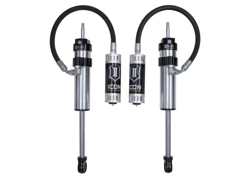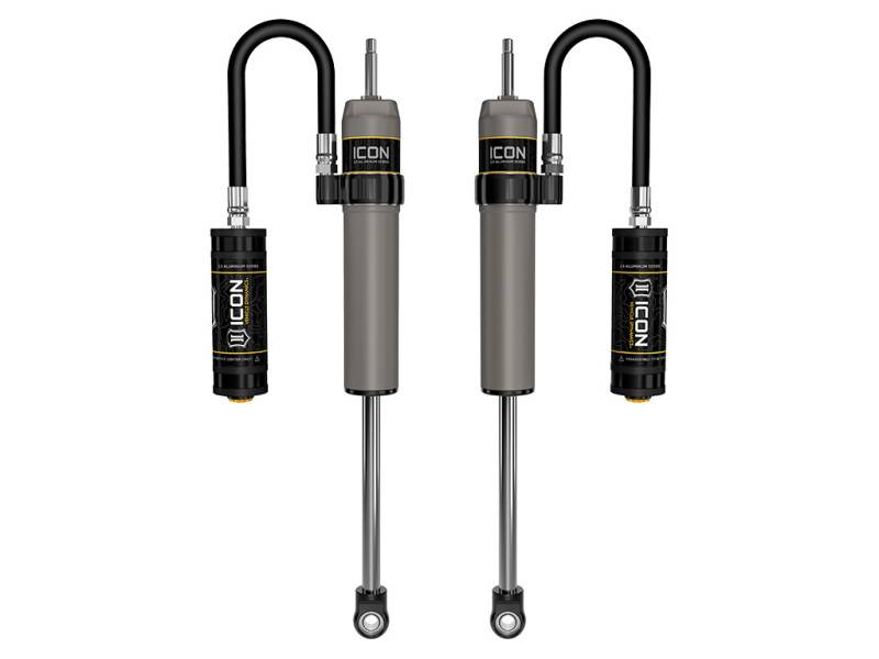 ICON Vehicle Specific (V.S.) 2.5 Series shocks are designed and built to give your vehicle outstanding performance off-road and a smooth ride on the street. These shocks are configured specifically for each application in both length and damping tune. Like all ICON'S Shock Absorbers, V.S. 2.5 Series shocks are 100% rebuildable and 100% revalveable. For piggyback and specific remote reservoir applications, ICON'S unique use of a 6061 billet aluminum manifold a few inches below the top cap of the shock creates an internal Bump Zone that when used creates an additional 20% of damping force. This additional force helps prevent harsh bottom outs and controls the suspension when compressing at high velocity. If you are looking for a more user defined tune, consider looking into the Compression Damping Control Valve (CDCV) or the Omega Series bypass shocks. ICON Vehicle Specific (V.S.) 2.5 Series shocks are designed and built to give your vehicle outstanding performance off-road and a smooth ride on the street. These shocks are configured specifically for each application in both length and damping tune. Like all ICON'S Shock Absorbers, V.S. 2.5 Series shocks are 100% rebuildable and 100% revalveable. For piggyback and specific remote reservoir applications, ICON'S unique use of a 6061 billet aluminum manifold a few inches below the top cap of the shock creates an internal Bump Zone that when used creates an additional 20% of damping force. This additional force helps prevent harsh bottom outs and controls the suspension when compressing at high velocity. If you are looking for a more user defined tune, consider looking into the Compression Damping Control Valve (CDCV) shocks.