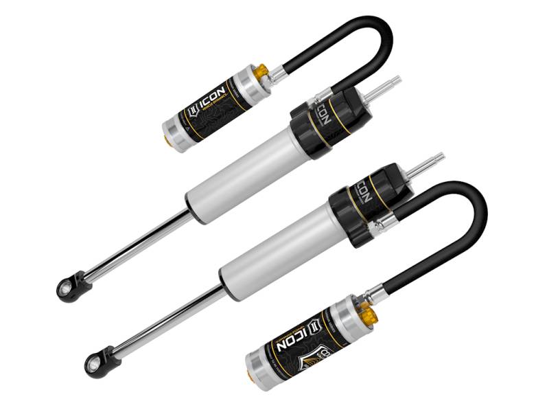 ICON’s 2.5 Aluminum Series shocks are designed and built to give your vehicle outstanding performance off-road and a smooth ride on the street. These shocks are configured specifically for each application in both length and damping tune. Featuring one-piece impact extruded aluminum cylinders, these 2.5 Aluminum Series shocks offer lighter weight, improved corrosion resistance, and a more uniform finish than traditional plated steel cylinders. Like all ICON'S Shock Absorbers, 2.5 Aluminum Series shocks are 100% rebuildable and 100% revalveable. For piggyback and specific remote reservoir applications, ICON'S unique use of a 6061 billet aluminum manifold a few inches below the top cap of the shock creates an internal Bump Zone that when used creates an additional 20% of damping force. This additional force helps prevent harsh bottom outs and controls the suspension when compressing at high velocity. The ICON CDC Valve is an externally adjustable valve that restri cts oil flow into the reservoir which creates 10 levels of compression damping force ranges. If you are looking for a more user defined tune, consider looking into the Omega Series bypass shocks. ICON’s 2.5 Aluminum Series shocks shocks are designed and built to give your vehicle outstanding performance off-road and a smooth ride on the street. These shocks are configured specifically for each application in both length and damping tune. Featuring one-piece impact extruded aluminum cylinders, these 2.5 Aluminum Series shocks offer lighter weight, improved corrosion resistance, and a more uniform finish than traditional plated steel cylinders. Like all ICON'S Shock Absorbers, 2.5 Aluminum Series shocks are 100% rebuildable and 100% revalveable. For piggyback and specific remote reservoir applications, ICON'S unique use of a 6061 billet aluminum manifold a few inches below the top cap of the shock creates an internal Bump Zone that when used creates an additional 20% of damping force. This additional force helps prevent harsh bottom outs and controls the suspension when compressing at high velocity. The ICON CDC Valve is an externally adjustable valve that restri cts oil flow into the reservoir which creates 10 levels of compression damping force ranges. If you are looking for a more user defined tune, consider looking into the Omega Series bypass shocks.