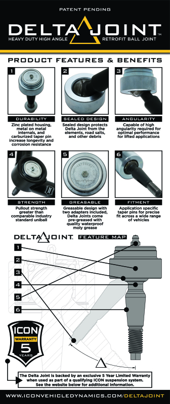Take the performance of your 1996-2004 Toyota Tacoma or 1996-2002 Toyota 4Runner to new levels with the ICON Vehicle Dynamics Delta Joint billet aluminum upper control arm kit. All ICON billet upper control arms are constructed from CNC machined 6061 aluminum and then finished in a matte anodization process for maximum strength and corrosion resistance. ICON billet aluminum upper control arms feature quality PTFE-lined rod ends and machined adjuster sleeves that allow for on-vehicle alignment adjustment and precision caster and camber tuning. Another major benefit of ICON upper control arms is the potential for increased wheel travel when paired with our extended travel coilovers. The additional droop travel provided by these components translates into superior performance and ride quality for your 1996-2004 Toyota Tacoma or 1996-2002 Toyota 4Runner. These upper control arms feature ICON's patented Delta Joint. The Delta Joint is a heavy-duty high angle ball joint that combines the durability of a ball joint with the performance characteristics of a traditional uniball. While the industry standard uniball does a great job of allowing the control arms of a vehicle to articulate with little bind, they do have an inherent weakness that leaves more to be desired when used in a daily driven application - exposure to the elements. The Delta Joint features a zinc plated housing providing the first layer of corrosion resistance, while a tough grease seal keeps potentially harmful elements out of the inner workings of the joint. Metal on metal construction and a greaseable design increase the longevity of the Delta Joint while at the same time allowing for noise-free operation. What makes the Delta Joint unique is that it brings the best of both worlds to ICON upper control arms with features that make it more robust than a uniball, and at the same time capable of greater angularity than a typical ball joint.