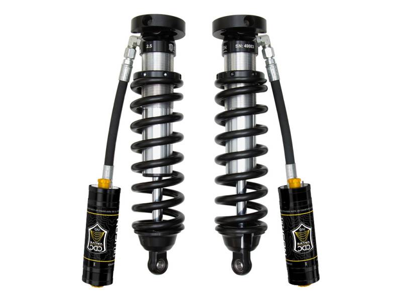 The ICON Vehicle Dynamics V.S. Series 2.5” remote reservoir coilover shocks w/ CDCV are an incredible upgrade for the front end of the 1996-2002 4Runner. ICON’s Vehicle-specific valving provides a sport tuned feel on and off-road while offering 0-3” of lift height adjustability for use of larger, more aggressive wheel and tire combinations. ICON's larger 2.5” shock body and increased piston area over stock components provides improved damping ability and outstanding ride characteristics across varying types of terrain. Remote reservoirs ensure optimum performance by increasing the duration of consistent damping regardless of situation, keeping the shocks at a cooler operating temperature during heavy use. The ICON CDC Valve upgrade is included for those desiring an easy way to tune the ride externally with 10 adjustment settings from soft to hard. When paired with ICON rear 2.0 Aluminum Series or 2.5 Series shocks, vehicle control will be balanced front to rear resulting in the best overall driving experience for your 4Runner.