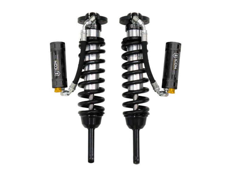 ICON Vehicle Dynamics V.S. 2.5 Series remote reservoir front coilover shocks are an incredible upgrade for the front end of the 2005-2023 Toyota Tacoma equipped with the Pro Comp 6” lift kit. These coilovers offer lift height adjustability, allowing fine tuning of ride height or the use of larger, more aggressive wheel and tire combinations. ICON’s Vehicle-specific shock length and valving along with the larger 2.5” shock body and increased piston area over stock components yield the maximum travel possible along with superior ride quality and suspension performance both on- and off-road. Remote reservoirs greatly increase shock oil volume and heat dissipation surface area to resist overheating and cavitation under hard use, which can lead to damper fade. ICON's exclusive Compression Damping Control Valves are included for precisely dialing in your suspension performance. CDCV controls fluid flow under compression, allowing you to achieve the perfect tune whether driving on the street, slow-crawling through the rocks or mobbing across the desert at full throttle. When paired with ICON 2.0 or 2.5 Aluminum Series rear shock absorbers vehicle control will be balanced front to rear, resulting in the best overall driving experience for your Toyota Tacoma.