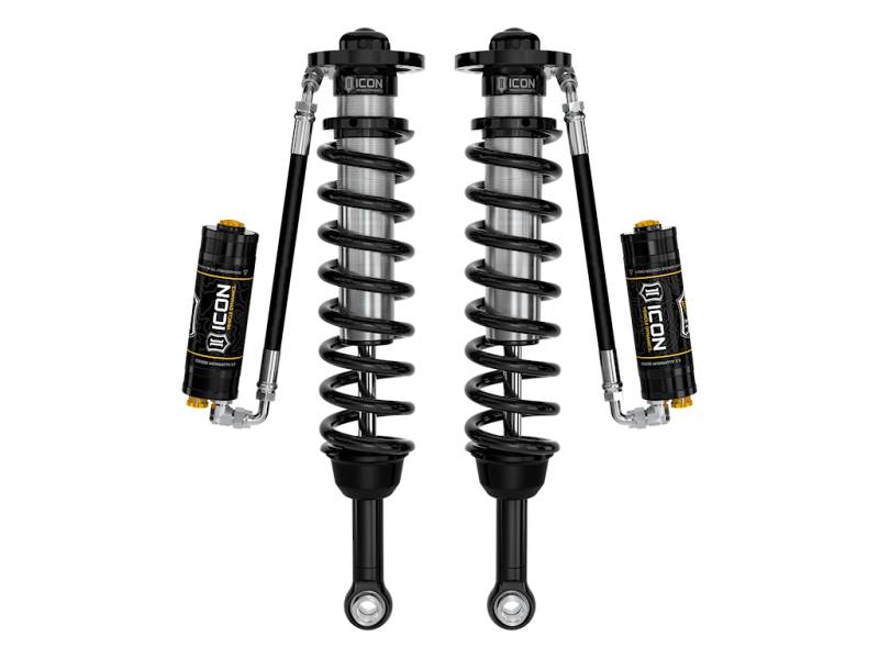 ICON Vehicle Dynamics V.S. 2.5 Series internal reservoir front coilover shocks are an incredible upgrade for the front end of the 2022-2023 Toyota Land Cruiser 300 Series. These adjustable coilovers allow up to 1-3” of lift height adjustability, allowing the use of larger, more aggressive wheel and tire combinations. ICON’s Vehicle-specific shock length and valving along with the larger 2.5” shock body and increased piston area over stock components yield the maximum travel possible along with superior ride quality and suspension performance both on- and off-road. Reservoirs greatly increase shock oil volume and heat dissipation surface area to resist overheating and cavitation under hard use, which can lead to damper fade. ICON's exclusive Compression Damping Control Valves are included for precisely dialing in your suspension performance. CDCV controls fluid flow under compression, allowing you to achieve the perfect tune whether driving on the street, slow-crawling through the rocks or mobbing across the desert at full throttle. When paired with ICON 2.5 Aluminum Series rear shocks vehicle control will be balanced front to rear, resulting in the best overall driving experience for your Toyota Land Cruiser 300 Series.