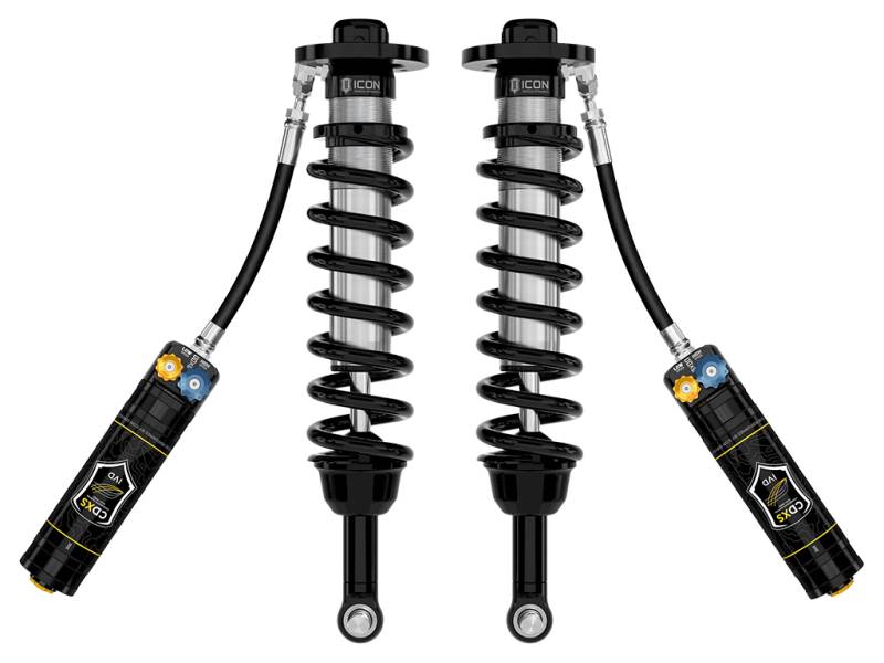 ICON Vehicle Dynamics V.S. 2.5 Series remote reservoir front coilover shocks are an incredible upgrade for the front end of the 2022-2024 Toyota Tundra. These adjustable coilovers are specifically designed for use the ICON 6" Lift Performance Suspension System and allow up to 5-6” of front lift height adjustability, allowing the use of larger, more aggressive wheel and tire combinations. ICON’s Vehicle-specific shock length and valving along with the larger 2.5” shock body and increased piston area over stock components yield the maximum travel possible along with superior ride quality and suspension performance both on- and off-road. Reservoirs greatly increase shock oil volume and heat dissipation surface area to resist overheating and cavitation under hard use, which can lead to damper fade. ICON's exclusive Compression Damping Dual Speed (CDXS) valves are included for precisely dialing in your suspension performance. CDXS controls fluid flow under compression, with independent adjustability of high speed and low speed compression force. 10 discreet detented settings for both low and high-speed adjustment knobs allow separate adjustments for handling response and overall aggressiveness. When paired with ICON 2.0 or 2.5 Aluminum Series rear shock absorbers vehicle control will be balanced front to rear, resulting in the best overall driving experience for your Toyota Tundra.