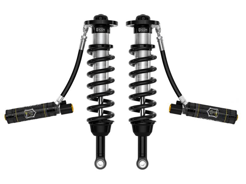 ICON Vehicle Dynamics V.S. 2.5 Series remote reservoir CDEV front coilover shocks are an incredible upgrade for the front end of the 2023-2025 Toyota Sequoia TRD Pro. These adjustable coilovers allow up to 1-2.5” of lift height adjustability on Sequoia TRD Pro, allowing the use of larger, more aggressive wheel and tire combinations. ICON’s Vehicle-specific shock length and valving along with the larger 2.5” shock body and increased piston area over stock components yield the maximum travel possible along with superior ride quality and suspension performance both on- and off-road. Remote reservoirs greatly increase shock oil volume and heat dissipation surface area to resist overheating and cavitation under hard use, which can lead to damper fade. ICON's exclusive Compression Damping Control Valves are included for precisely dialing in your suspension performance. Additionally, their vehicle specific shock length allows the stock, billet TRD front upper control arms to be utilized with the new suspension system, eliminating the requirement for ICON front UCAs. The ICON CDE Valve upgrade is included for those desiring an easy way to tune the ride electronically from inside the vehicle. Compression Damping Electronic Valve (CDEV) is an electronically controlled valve that meters the flow of oil to regulate the amount of damping force that is created by the shock when compressed. This infinitely variable valve can react in less than 40ms and has the ability to make extremely precise adjustments for varying terrain. CDEV’s hydraulic circuits are also custom tailored per application to create the highest resolution and dynamic range allowable for each specific vehicle. Powered by ICON Intelligent Control and proprietary ICON mobile app, the system uses information from the onboard G-force sensor and Gyroscope to perform calculations based on algorithms and user-defined settings to predict terrain and adjust shock settings via the CDEV accordingly. When paired with ICON 2.5 or 3.0 Series CDEV rear shocks vehicle control will be balanced front to rear, resulting in the best overall driving experience for your Toyota Sequoia TRD Pro.