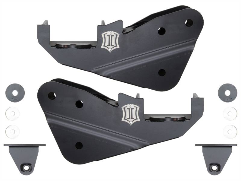 The ICON Radius Arm Drop Kit for the 2017-2022 Ford F-250/F-350 Super Duty 4WD allows the use of the stock or aftermarket radius arms with ICON 4.5”-7” lift suspension systems. This kit consists of fabricated radius arm drop brackets, CNC laser cut and brake-formed from steel plate and engineered to withstand the stresses of aggressive off-road driving. The drop brackets look as great as they perform with a durable semi-gloss black powder coat finish. Wheel with confidence knowing that the brackets are covered by ICON's Limited Lifetime Warranty.