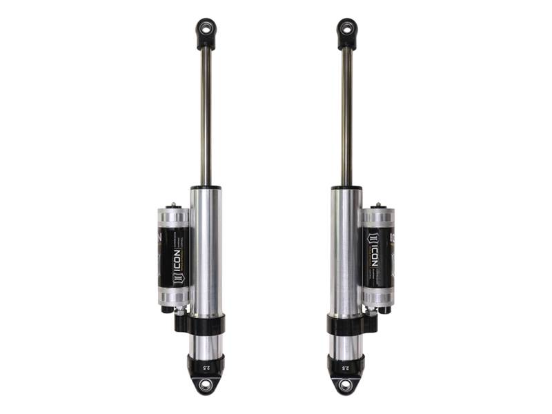 ICON Vehicle Specific (V.S.) 2.5 Series shocks are designed and built to give your vehicle outstanding performance off-road and a smooth ride on the street. These shocks are configured specifically for each application in both length and damping tune. Like all ICON shock absorbers, V.S. 2.5 Series shocks are 100% rebuildable and 100% revalveable. For piggyback and specific remote reservoir applications, ICON’s unique use of a 6061 billet aluminum manifold a few inches below the top cap of the shock creates an internal “Bump Zone” that when used creates an additional 20% of damping force. This additional force helps prevent harsh bottom outs and controls the suspension when compressing at high velocity. The ICON CDC Valve is an externally adjustable valve that restricts oil flow into the reservoir which creates 10 levels of compression damping force ranges. ICON Vehicle Specific (V.S.) 2.5 Series shocks are designed and built to give your vehicle outstanding performance off-road and a smooth ride on the street. These shocks are configured specifically for each application in both length and damping tune. Like all ICON shock absorbers, V.S. 2.5 Series shocks are 100% rebuildable and 100% revalveable. For piggyback and specific remote reservoir applications, ICON’s unique use of a 6061 billet aluminum manifold a few inches below the top cap of the shock creates an internal “Bump Zone” that when used creates an additional 20% of damping force. This additional force helps prevent harsh bottom outs and controls the suspension when compressing at high velocity. The ICON CDC Valve is an externally adjustable valve that restricts oil flow into the reservoir which creates 10 levels of compression damping force ranges.