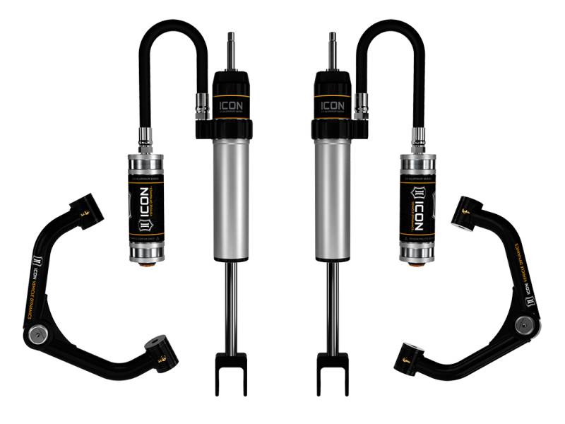 Take the performance of your 2020-Up GM HD truck to new levels with the ICON Vehicle Dynamics Delta Joint tubular upper control arm kit. All ICON tubular upper control arms are constructed from CNC bent 1026 DOM steel tubing and then powder coated to a semi-gloss black finish for maximum strength and corrosion resistance. ICON upper control arms are engineered with built-in caster correction for optimal alignment specifications and confidence inspiring handling. A main benefit of ICON upper control arms is the increased wheel travel when paired with our 2.5 series shock absorbers, this translates into superior performance and ride quality for your 2020-Up GM HD. These upper control arms feature ICON's patented Delta Joint. The Delta Joint is a heavy-duty high angle ball joint that combines the durability of a ball joint with the performance characteristics of a traditional uniball. While the industry standard uniball does a great job of allowing the control arms of a vehicle to articulate with little bind, they do have an inherent weakness that leaves more to be desired when used in a daily driven application - exposure to the elements. The Delta Joint features a zinc plated housing providing the first layer of corrosion resistance, while a tough grease seal keeps potentially harmful elements out of the inner workings of the joint. Metal on metal construction and a greaseable design increase the longevity of the Delta Joint while at the same time allowing for noise-free operation. What makes the Delta Joint unique is that it brings the best of both worlds to ICON upper control arms with features that make it more robust than a uniball, and at the same time capable of greater angularity than a typical ball joint. To ensure compatibility, ICON is no longer offering GM 2500HD/3500HD upper control arms as individual components. Upper control arms can only be purchased in unison with ICON shock absorbers as a complete system. The included ICON Vehicle Specific (V.S.) 2.5 Aluminum Series shocks are designed and built to give your vehicle outstanding performance off-road and a smooth ride on the street. These shocks are configured specifically for each application in both length and damping tune. Like all of ICON's Shock Absorbers, the V.S. 2.5 Series shocks are 100% rebuildable and 100% revalveable. For piggyback and specific remote reservoir applications, ICON'S unique use of a 6061-billet aluminum manifold a few inches below the top cap of the shock creates an internal Bump Zone that when used creates an additional 20% of damping force. This additional force helps prevent harsh bottom outs and controls the suspension when compressing at high velocity. Remote reservoirs ensure optimum performance by increasing the duration of consistent damping regardless of situation, keeping the shocks at a cooler operating temperature during heavy use.