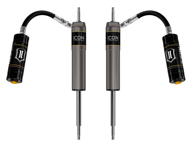 ICON Vehicle Specific (V.S.) 2.5 Aluminum Series shocks are designed and built to give your vehicle outstanding performance off-road and a smooth ride on the street. These shocks are configured specifically for each application in both length and damping tune. Like all ICON'S Shock Absorbers, V.S. 2.5 Aluminum Series shocks are 100% rebuildable and 100% revalveable. The larger 2.5” shock body and increased piston area over stock components provides improved damping ability and outstanding ride characteristics across varying types of terrain. Remote reservoirs ensure optimum performance by increasing the duration of consistent damping regardless of situation, keeping the shocks at a cooler operating temperature during heavy use. If you are looking for a more user defined tune, consider looking into the Compression Damping Control Valve (CDCV) shocks.