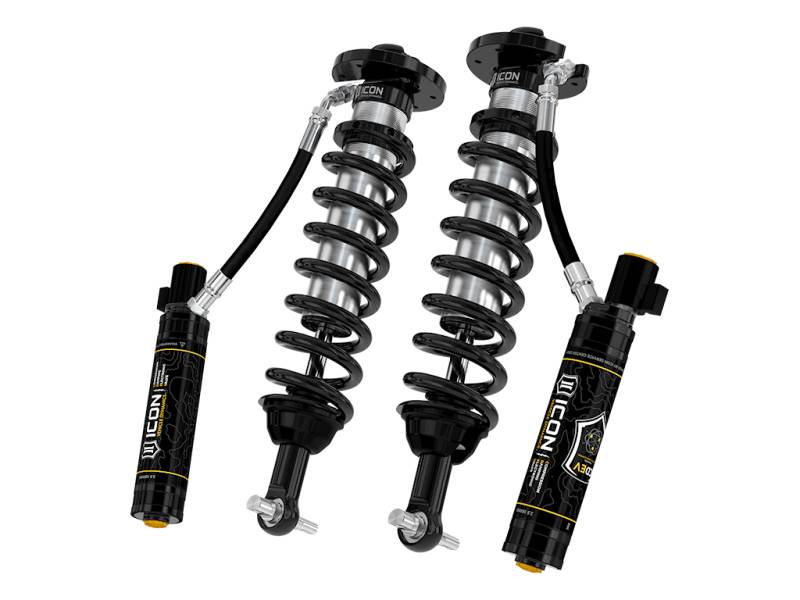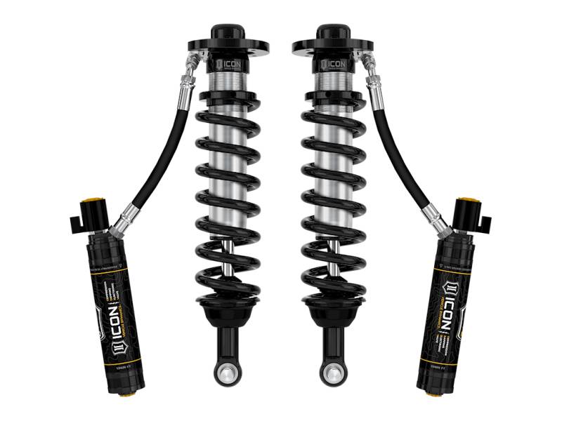 Experience unmatched performance with the ICON Vehicle Dynamics V.S. 2.5 Series remote reservoir front coilover shocks with CDEV, the ultimate upgrade for your 2022-2023 Ford F-150 Lightning. These coilovers deliver an aggressive stance, lower center of gravity, and unparalleled handling characteristics, thanks to their adjustable front lowered height range of 0-2" under stock. With ICON's vehicle specific shock length, valving, and the larger 2.5" shock body with increased piston area, you will enjoy maximum wheel travel, exceptional ride quality, and superior suspension performance that surpasses stock components. Prepare for intense driving conditions with confidence, as the remote reservoirs significantly increase shock oil volume and heat dissipation surface area, resisting overheating and cavitation under aggressive use, preventing damper fade. Additionally, the ICON CDE Valve upgrade is included, providing easy ride tuning capabilities from inside your vehicle. The Compression Damping Electronic Valve (CDEV) is an electronically controlled valve that regulates oil flow into the reservoir, reacting in less than 40ms to make accurate adjustments for varying terrain. The hydraulic circuits of CDEV are meticulously tailored per application, offering the highest resolution and dynamic range specific to your F-150 Lightning. Take control of your suspension like never before with the power of ICON Intelligent Control and the proprietary ICON mobile app. This innovative system leverages information from the onboard G-force sensor and gyroscope, utilizing cutting-edge algorithms and user-defined settings to predict terrain and actively adjust shock damping settings via CDEV accordingly. When combined with ICON 2.5 Series CDEV rear coilovers, your vehicle's control will be balanced front to rear, providing you with the ultimate driving experience for your F-150 Lightning.