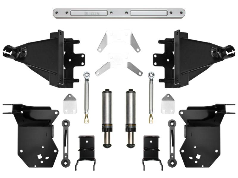The ICON Raptor Bump Stop System includes heavy duty steel clamshell brackets, a billet aluminum frame crossmember, adjustable tension rods, hydraulic bump stops, and all of the necessary hardware required to complete the installation. The clamshell brackets, crossmember, and tension rods add strength to the frame to prevent damage during extreme off-road use while increasing chassis rigidity for predictable handling and improved vehicle dynamics. The 2.5” travel hydraulic bump stops feature velocity sensitive technology which means that as the shaft speed increases the damping ability ramps up, resulting in exponential bottoming resistance that won’t negatively affect articulation. Combining all of these components into an easy to install, bolt-on package, ICON has developed the most comprehensive rear bump stop solution on the market for Raptor owners seeking the next level of strength and performance. The ICON Raptor Bump Stop System includes heavy duty steel clamshell brackets, a billet aluminum frame crossmember, adjustable tension rods, hydraulic bump stops, and all of the necessary hardware required to complete the installation. The clamshell brackets, crossmember, and tension rods add strength to the frame to prevent damage during extreme off-road use while increasing chassis rigidity for predictable handling and improved vehicle dynamics. The 2.5” travel hydraulic bump stops feature velocity sensitive technology which means that as the shaft speed increases the damping ability ramps up, resulting in exponential bottoming resistance that won’t negatively affect articulation. Combining all of these components into an easy to install, bolt-on package, ICON has developed the most comprehensive rear bump stop solution on the market for Raptor owners seeking the next level of strength and performance.