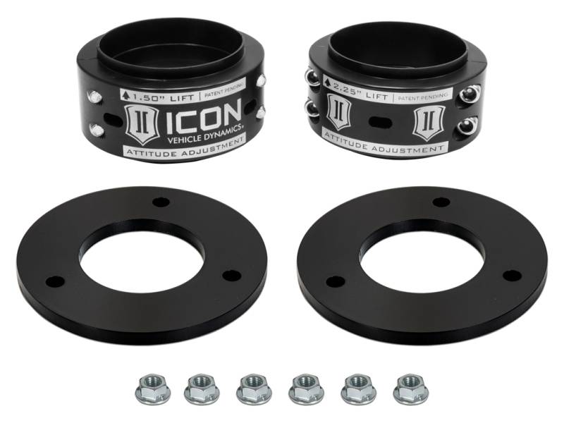The ICON Attitude Adjustment Collar (AAC) is an industry first, patent pending multi-height coil spring collar that works in conjunction with a top load shim that can be configured in five unique ways to yield .5” to 2.25” of front lift height over stock. Taking the front end dimensions of the "Gen 2" Raptor into account, the collar and shim design of this leveling system achieves this range of lift height while keeping the OE shock in the ride zone, maintaining factory ride quality. Other options on the market achieve lift height solely through coil preload, which places the shock in the rebound zone at ride height and drastically impacts ride quality and performance. Installation of this leveling system requires no disassembly of the shock, making it a simple and straightforward process as opposed to other options currently available. CNC machined 6061 billet aluminum construction and a black anodized finish mean this product can stand up to the test of time in the harshest on and off-road conditions. Backed by ICON’s limited lifetime warranty, the ICON Vehicle Dynamics Attitude Adjustment Collar is the best leveling solution on the market for the 2017-2020 Ford Raptor. The ICON Attitude Adjustment Collar (AAC) is an industry first, patent pending multi-height coil spring collar that works in conjunction with a top load shim that can be configured in five unique ways to yield .5” to 2.25” of front lift height over stock. Taking the front end dimensions of the "Gen 2" Raptor into account, the collar and shim design of this leveling system achieves this range of lift height while keeping the OE shock in the ride zone, maintaining factory ride quality. Other options on the market achieve lift height solely through coil preload, which places the shock in the rebound zone at ride height and drastically impacts ride quality and performance. Installation of this leveling system requires no disassembly of the shock, making it a simple and straightforward process as opposed to other options currently available. CNC machined 6061 billet aluminum construction and a black anodized finish mean this product can stand up to the test of time in the harshest on and off-road conditions. Backed by ICON’s limited lifetime warranty, the ICON Vehicle Dynamics Attitude Adjustment Collar is the best leveling solution on the market for the 2017-2020 Ford Raptor.