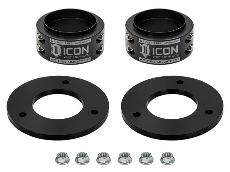 The ICON Attitude Adjustment Collar (AAC) is an industry first, patent pending multi-height coil spring collar that works in conjunction with a top load shim that can be configured in five unique ways to yield .5” to 2.5” of front lift height over stock. Taking the front-end dimensions of the "Gen 3" F-150 Raptor into account, the collar and shim design of this leveling system achieves this range of lift height while keeping the OE shock in the ride zone, maintaining factory ride quality. Other options on the market achieve lift height solely through coil preload, which places the shock in the rebound zone at ride height and drastically impacts ride quality and performance. Installation of this leveling system requires no disassembly of the shock, making it a simple and straightforward process as opposed to other options currently available. CNC machined 6061 billet aluminum construction and a black anodized finish mean this product can stand up to the test of time in the harshest on and off-road conditions. Backed by ICON’s limited lifetime warranty, the ICON Vehicle Dynamics Attitude Adjustment Collar is the best leveling solution on the market for the 2021-2025 Ford F-150 Raptor.