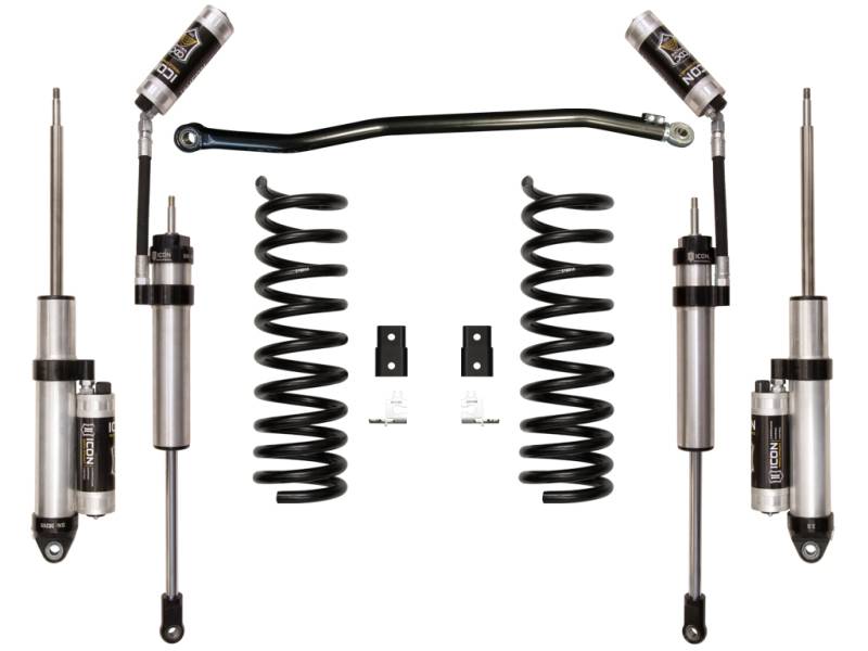 After a thorough inspection of the Ram’s air ride assembly, ICON developed components that properly locate the airbags and associated parts so they are not over-traveled and damaged. This air ride-specific system allows for full functionality of factory air ride modes. Use of optional ICON 2" Air Ride Kit (Part #214212) allows for end-user adjustability of rear ride height from stock to 2" over stock. ICON's 2014-UP Ram 2500 4WD 2.5” Stage 4 Suspension System is made up of dual rate front coil springs, necessary bracketry and hardware, front adjustable track bar, as well as 2.5 Aluminum Series reservoir front and rear shocks with CDCV. This system improves ride quality and performance both on and off-road. The ICON stage 4 system is great for towing, rough construction site terrain, and country dirt roads all while keeping a smooth highway feel. ICON 2.5" reservoir shocks with CDCV ensure optimum performance by increasing the duration of consistent damping regardless of situation, keeping the shocks at a cooler operating temperature during heavy use. The ICON CDC Valve upgrade is included in this stage for those desiring an easy way to tune the ride externally. An adjustable track bar with FK bearings is used to not only improve rigidity over the flexible factory joints, but offer adjustability to center the front axle under the truck. With the endless hours ICON has spent testing and tuning our suspension components and shocks as a complete package, you can rest assured you have the best suspension solution on the market.