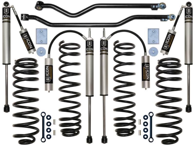 The ICON Vehicle Dynamics 3" Lift Suspension System is designed for Jeep JK owner's demanding the ultimate in performance and ride quality, without the larger stance you find in bigger lift systems on today's market. ICON's Jeep Wrangler JK 3" lift system is engineered with front and rear dual rate progressive wound springs which is the foundation for on and off-road performance and suspension articulation. The dual rate design gives you a softer initial rate for superb on road comfort and a firmer than stock secondary rate that increases during compression for excellent bottom out control. ICON V.S. 2.0 Aluminum Series Remote Reservoir shocks add the finishing touch with OE mounting, aircraft grade components, and vehicle specific valving. Remote Reservoir shocks are great for additional heat dissipation to prevent shock fade during off road use. Together the combination of ICON dual rate coils and V.S. 2.0 Aluminum Series shocks adds 30% more wheel travel over stock, helping you rock crawl safer or soak up larger terrain at higher speeds keeping those wheels on the ground. In this Stage 3 system adjustable track bars are included front and rear for optimizing axle position to ensure your axles are perfectly centered under the vehicle. This ICON 3" JK lift system is designed from the ground up to give the Jeep Wrangler JK's the best performance, suspension handling / ride quality, and clearance for 33" tall tires (35" tall with installation of aftermarket high-clearance fenders).