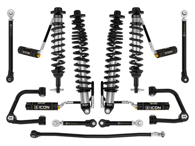 The ICON Vehicle Dynamics Stage 7 Suspension System for the 2021-2023 Ford Bronco features our precision-manufactured, custom valved remote reservoir coilover shocks with CDCV to yield the maximum travel possible along with superior ride quality and suspension performance both on and off-road. These coilovers also allow for the adjustment of ride height to yield 3-4” of front lift and 2-3” of rear lift over stock 4-door Broncos without the Sasquatch Package. The rear coilovers are mounted in a shaft up orientation and feature unique ICON engineered progressive dual rate coil springs that provide extra weight capacity for those who frequently load out their Broncos with extra gear and equipment while maintaining excellent on- and off-road performance characteristics. Remote reservoirs greatly increase shock oil volume and heat dissipation surface area to resist overheating and cavitation under hard use, which can lead to damper fade, ensuring sustained shock performance at speed through rough terrain. The included CDC Valves control fluid flow under compression, allowing you to achieve the perfect shock tune whether driving on the street, slow-crawling through the rocks or mobbing across the desert at full throttle. This suspension system is designed to provide up to 11.5" of front suspension travel and 14" of rear suspension travel when used with 35X12.50 tires. It may be safely used with 37" and larger tires if using the optional up-travel limiters (sold separately). The factory crash bars on non-Sasquatch equipped Broncos must be removed to clear 35" and larger tires, but ICON now offers a replacement High Clearance Crash Bar set for those who would like to run larger tires and retain the functionality of the crash bars. To accommodate the increased travel and lift height afforded by the ICON Coilovers, this Stage 7 kit comes with Tubular Upper Control Arms which provide caster correction and feature our patented Delta Joint PRO, which allows for up to 90-degrees freedom of movement. Stage 7 also includes the complete tubular rear link kit including upper links and ICON's Adjustable Rear Track Bar. The added upper links have been designed for clearance from the fuel tank during maximum articulation and feature greaseless bushings and massive FK rod ends just like the lower links. The Adjustable Track Bar also features our dual-durometer greaseless bushing and an FK Rod End, as well as on-vehicle adjustability for perfectly aligning the Bronco's rear axle for any lift height.