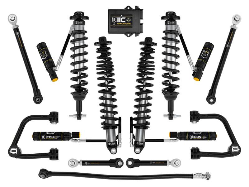 The ICON Vehicle Dynamics Stage 8 Suspension System for the 2021-2023 Ford Bronco features our precision-manufactured, custom valved remote reservoir coilover shocks with CDEV to yield the maximum travel possible along with superior ride quality and suspension performance both on and off-road. These coilovers also allow for the adjustment of ride height to yield 3-4” of front lift and 2-3” of rear lift over stock 4-door Broncos without the Sasquatch Package. The rear coilovers are mounted in a shaft up orientation and feature unique ICON engineered progressive dual rate coil springs that provide extra weight capacity for those who frequently load out their Broncos with extra gear and equipment while maintaining excellent on- and off-road performance characteristics. Remote reservoirs greatly increase shock oil volume and heat dissipation surface area to resist overheating and cavitation under hard use, which can lead to damper fade, ensuring sustained shock performance at speed through rough terrain. ICON's Top of The Range suspension system features lightning fast, precise electronic shock tuning, on-the-fly, at any speed and in any terrain. Focus on driving and let ICON Intelligent Control (IIC) read the terrain and make near-instant adjustments via the Compression Damping Electronic Valve (CDEV) at each individual shock. Control the system wirelessly through the IIC app on your phone and once configured the system functions without driver input. This Stage 8 kit comes with Tubular Upper Control Arms which provide caster correction and feature our patented Delta Joint PRO, which allows for up to 90-degrees freedom of movement. The tubular rear links links have been designed to free up suspension bind, offer pinion angle adjustment, and optimize clearance from the fuel tank during maximum articulation and feature greaseless bushings and massive FK rod ends. The Adjustable Track Bar also features our dual-durometer greaseless bushing and an FK Rod End, as well as on-vehicle adjustability for perfectly aligning the Bronco's rear axle for any lift height. This suspension system is designed to provide up to 11.5" of front suspension travel and 14" of rear suspension travel when used with 35X12.50 tires. It may be safely used with 37" and larger tires if using the optional up-travel limiters (sold separately). The factory crash bars on non-Sasquatch equipped Broncos must be removed to clear 35" and larger tires, but ICON now offers a replacement High Clearance Crash Bar set for those who would like to run larger tires and retain the functionality of the crash bars.