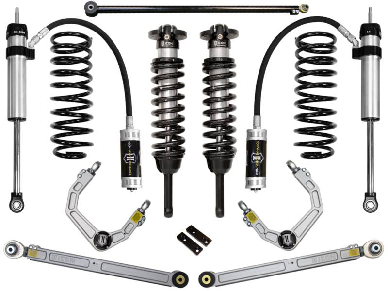The Stage 4 system includes vehicle-specific tuned, extended travel 2.5” coilover shocks with internal reservoirs paired with billet aluminum Delta Joint upper control arms. This combination allows for extended wheel travel and on-vehicle adjustment of the upper control arms to dial in front end alignment. The coilovers are also height adjustable from 0-3.5” of lift over stock, allowing the use of larger, more aggressive wheel and tire combinations. ICON 2” lift rear coil springs paired with 2.5 Aluminum Series remote reservoir rear shocks utilizing vehicle-specific valving offer increased performance compared to the 2.0 Aluminum Series shocks. ICON's billet aluminum lower links are much stronger than the OE units, improve articulation, and can be adjusted while installed on the vehicle for optimum pinion angle. On top of it all, these links have been designed to provide correct roll steer geometry for the best possible handling on and off-road. An adjustable rear track bar is also included for KDSS compatibility that also helps correct rear end alignment. The ICON Vehicle Dynamics 2010-UP Lexus GX460 Stage 4 suspension system is an excellent choice for those drivers looking to enhance the capabilities of their pickup on the road as well as in the dirt. This system features upper control arms with ICON's patented Delta Joint. The Delta Joint is a heavy-duty high angle ball joint that combines the durability of a ball joint with the performance characteristics of a traditional uniball. While the industry standard uniball does a great job of allowing the control arms of a vehicle to articulate with little bind, they do have an inherent weakness that leaves more to be desired when used in a daily driven application - exposure to the elements. The Delta Joint features a zinc plated housing providing the first layer of corrosion resistance, while a tough grease seal keeps potentially harmful elements out of the inner workings of the joint. Metal on metal construction and a greaseable design increase the longevity of the Delta Joint while at the same time allowing for noise-free operation. What makes the Delta Joint unique is that it brings the best of both worlds to ICON upper control arms with features that make it more robust than a uniball, and at the same time capable of greater angularity than a typical ball joint.