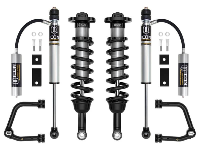 APPLICATION NOTE #142: Not compatible with vehicles equipped with Load-Leveling Rear Height Control Air Suspension. APPLICATION NOTE #149: FOR 4WD MODELS WITHOUT TRD OFF-ROAD PACKAGE ICON RECOMMENDS USING ICON DIFF DROP (PART# 55156) OR USING TOYOTA TRD AXLES (PART# 434200C020 DRIVER / 434100C020 PASS). FAILURE TO DO SO COULD RESULT IN FRONT AXLE DAMAGE. NOT REQUIRED FOR TRD PRO. APPLICATION NOTE #153: Not compatible with Adaptive Variable Suspension (AVS) equipped vehicles APPLICATION NOTE #155: Requires recalibration of Advanced Driver Assistance Systems (ADAS) after install APPLICATION NOTE #171: If equipped with TRD aluminum skid plate part # 55164 is also required APPLICATION NOTE #55: SHOCKS ARE FULLY SERVICEABLE. LIFT HEIGHTS INDICATED ARE FOR A STOCK EQUIPPED VEHICLE. APPLICATION NOTE #85: Advertised lift height ranges are for a stock equipped vehicle. Increasing weight of vehicle due to accessories will alter lift lange. OEM Wheels & Tires Fitment: Yes Recommended Aftermarket Tires: 35" x 12.50" (Minor fender trimming and modifications may be required) Recommended Aftermarket Wheels: ICON Alloys - 17x8.5" w/ 5.75” Backspace / 25mm Offset TECH NOTE: Included rear shocks are compatible with 0-1.5" of rear lift over stock on models equipped with rear coil springs without TRD suspension package. Rear shocks are compatible with 0-1" of rear lift over stock on models equipped with rear coil springs with TRD suspension package and TRD Pro. TECH NOTE: Most Tundra sub-models equipped with i-Force gasoline engine will have front lift height range of 2-3.5" over stock TECH NOTE: Most Tundra sub-models equipped with i-Force MAX hybrid engine will have front lift height range of 2-3" over stock TECH NOTE: Tundra SR5 equipped with TRD Sport Suspension package will have lift height range of 3-4.5” over stock TECH NOTE: Tundra TRD Pro will have front lift height range of 0-1.75" over stock