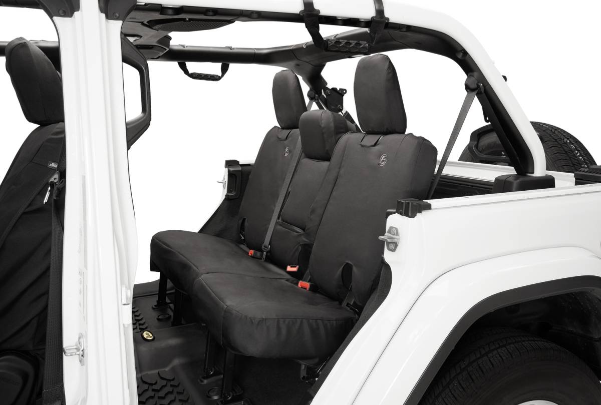 Put some great looking protection on those new Wrangler factory seats. Bestop put its best fabric experts to work on making these the best-fitting, best-looking, most durable seat covers we've ever offered. Installation requires no drilling or cutting. This rear black seat cover fits the Jeep Wranlger JL with the folding armrest.
