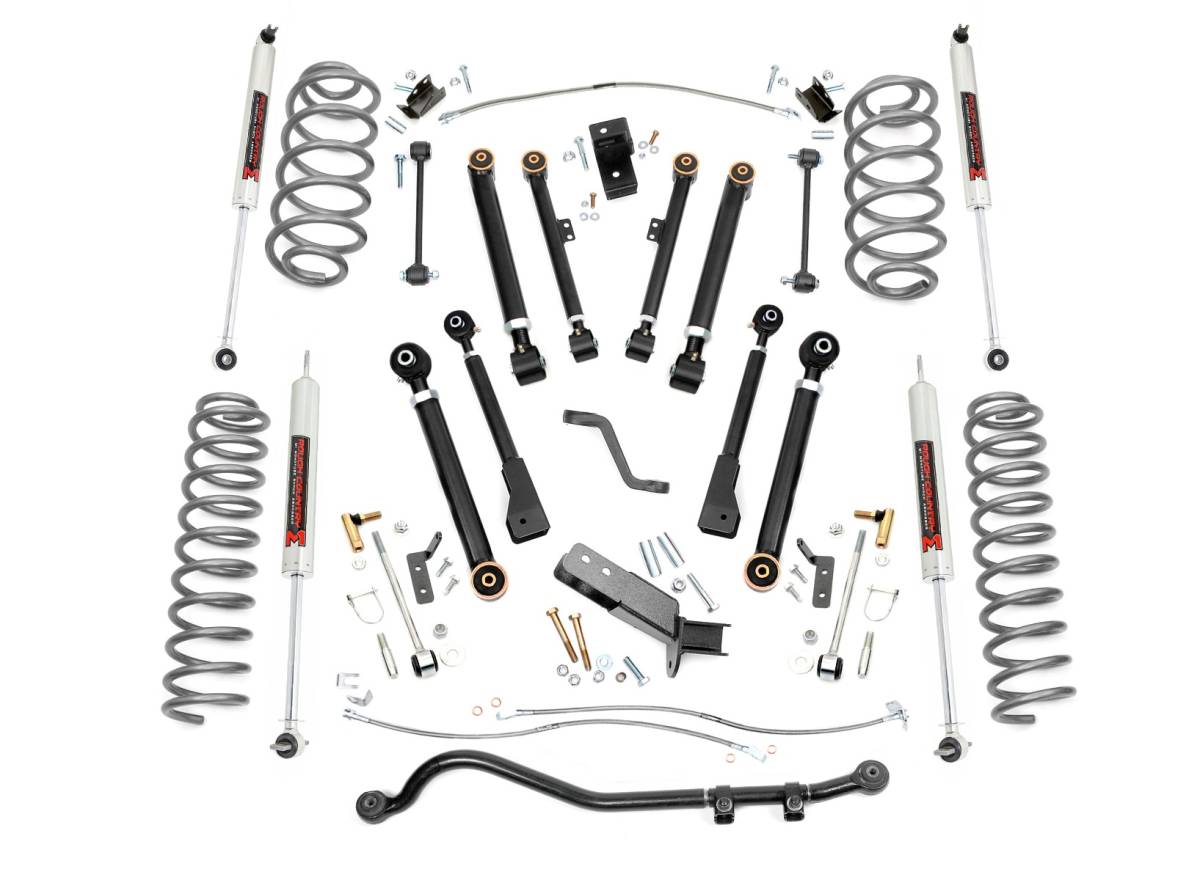 It's fully adjustable on the vehicle and easy to install. Custom Shock Options for Any Terrain: Choose your ideal ride with Rough Country's premium shock upgrades. The included nitrogen-charged N3 shocks offer 10-stage variable valving and a 54mm shock body for faster cooling and up to 36kN tensile strength. For those craving next-level performance, optional V2 performance shocks or M1 monotube shocks are available to match your driving style. Confident, Balanced Stance: This lift kit levels the front of your Jeep with the rear, delivering a commanding, well-balanced look that performs as good as it looks. Peace of Mind Guaranteed: Backed by Rough Country's Limited Lifetime Replacement Warranty, you can hit the trails with confidence knowing your investment is protected. Total Transformation, On and Off the Trail: Give your Jeep TJ the ultimate upgrade with Rough Country's 4in X-Series Suspension Lift Kit. This all-inclusive package delivers everything you need for aggressive styling, increased ground clearance, and enhanced off-road capability. Precision Adjustable Control Arms: This kit includes front and rear upper and lower X-Flex Control Arms featuring a high-clearance design. Built with OEM-style rubber bushings, fully rebuildable flex joints, and massive 2.5" diameter bodies with 1.25" threads, these control arms are fully greaseable for long-lasting durability and superior articulation. Fine-tune your ride height and suspension geometry with ease. Optimized Suspension Geometry: Lifted coil springs provide the perfect combination of ride height and vibration dampening, delivering optimal suspension performance across any terrain. This kit also includes durable stainless steel brake lines for improved reliability and safety. Heavy-Duty Forged Adjustable Track Bar: When it comes to strength and stability, the forged solid steel Adjustable Front Track Bar delivers. Weighing a robust 16 pounds, this track bar outmatches stock components, ensuring precise axle alignment and control even during extreme off-road flexing.