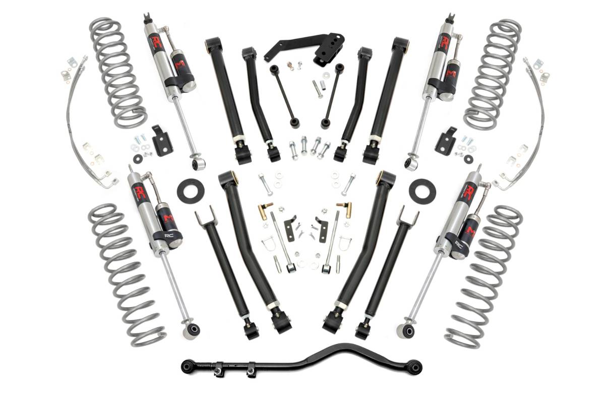 Total transformation on and off the trail starts with Rough Country's 4-Inch X-Series Suspension Lift Kit for Jeep. This all-inclusive package delivers aggressive styling, increased ground clearance, and enhanced off-road capability for the ultimate upgrade. Precision Adjustable Control Arms: This kit includes front and rear upper and lower X-Flex Control Arms featuring a high-clearance design. Built with OEM-style rubber bushings, fully rebuildable flex joints, and massive 2.5-inch diameter bodies with 1.25-inch threads, these arms are fully greaseable for long-lasting durability and superior articulation. Fine-tune your ride height and suspension geometry with ease. Optimized Suspension Geometry: Lifted coil springs and rear coil correction plates provide the perfect combination of ride height and vibration dampening. The correction plates adjust the rear coil spring angle by 10 degrees, allowing for optimal suspension performance across any terrain. Heavy-Duty Forged Adjustable Track Bar: Strength and stability are delivered by a 16-pound forged solid steel Adjustable Front Track Bar. This heavy-duty component outmatches stock parts, maintaining precise axle alignment and control even during extreme off-road flexing. It's fully adjustable on the vehicle and easy to install. Custom Shock Options for Any Terrain: Select from nitrogen-charged N3 shocks, V2, M1 Monotube, or premium M1R shocks to match your driving style. From versatile daily comfort to maximum off-road control, this kit lets you tailor your suspension for any adventure. Confident, Balanced Stance: This lift kit levels the front of your Jeep with the rear, creating a commanding, well-balanced look that performs as good as it looks. Peace of Mind Guaranteed: Backed by Rough Country's Limited Lifetime Replacement Warranty, you can hit the trails knowing your investment is protected.