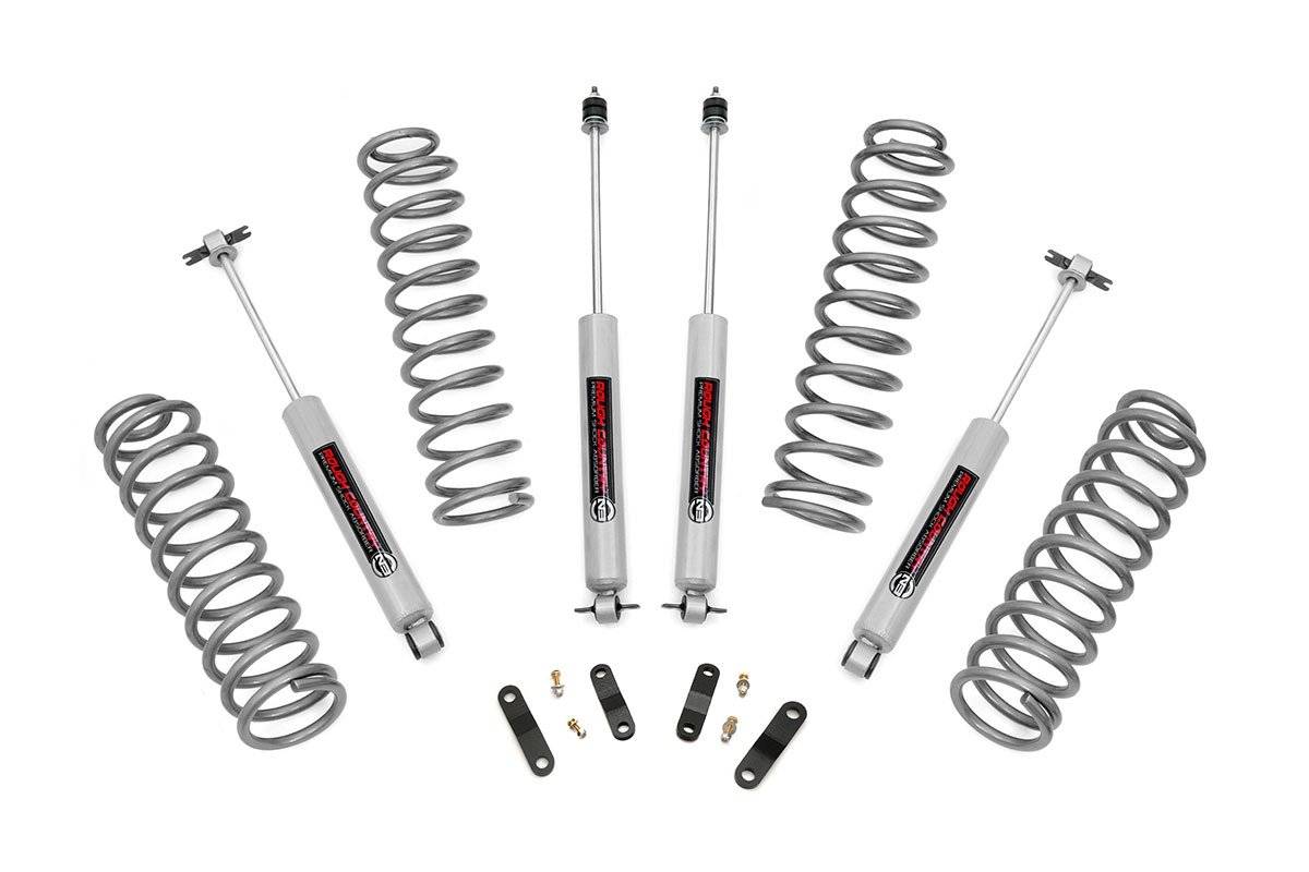 Elevate your Jeep's off-road capability and style with Rough Country's 2.5-Inch Suspension Lift Kit. Designed for larger wheels and tires, this kit increases ground clearance and delivers a bold, aggressive stance on and off the trail. Lifted Front and Rear Coil Springs: Enjoy a taller ride height while maintaining factory-like ride comfort. These coils are tuned to match the OEM spring rate, providing balanced handling whether you're navigating rocky terrain or cruising pavement. Configurable Shock Options: Choose the perfect ride feel for your driving needs. This kit offers nitrogen-charged N3 shocks, monotube V2 and M1 options, or the premium M1R remote reservoir shocks for ultimate performance and control. Hassle-Free Installation: This kit includes all necessary components for a simple, bolt-on installation, getting you trail-ready without complicated modifications. Trail-Tested Durability: Backed by Rough Country's Limited Lifetime Replacement Warranty, this suspension lift is built to handle harsh environments and rugged adventures. Upgrade your Jeep today and conquer the trail with Rough Country's 2.5-Inch Suspension Lift Kit, where performance meets unmistakable style.