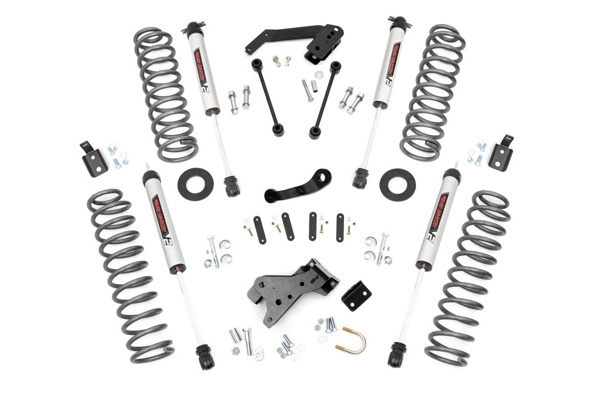 Total transformation for your Jeep starts with Rough Country's 4-Inch Suspension Lift Kit. This all-inclusive upgrade delivers aggressive styling, enhanced ground clearance, and the rugged performance you need to conquer any trail with confidence. Engineered for Superior Suspension Geometry: Lifted coil springs pair with coil correction plates that adjust the rear coil spring angle by 10 degrees. This design improves suspension efficiency, reduces component wear, and optimizes vibration dampening across rough terrain. Custom Shock Options: Tailor your ride with nitrogen-charged N3 shocks, V2, M1 Monotube, or premium M1R shocks. Whether you want balanced on-road comfort or elite off-road control, this kit lets you fine-tune performance to your driving style. Clears Up to 35-Inch Tires: Gain the clearance to run up to 35-inch tires, giving your Jeep a commanding stance and greater off-road capability. Backed by Rough Country's Limited Lifetime Warranty: Drive with confidence knowing your investment is protected with Rough Country's limited lifetime replacement warranty.