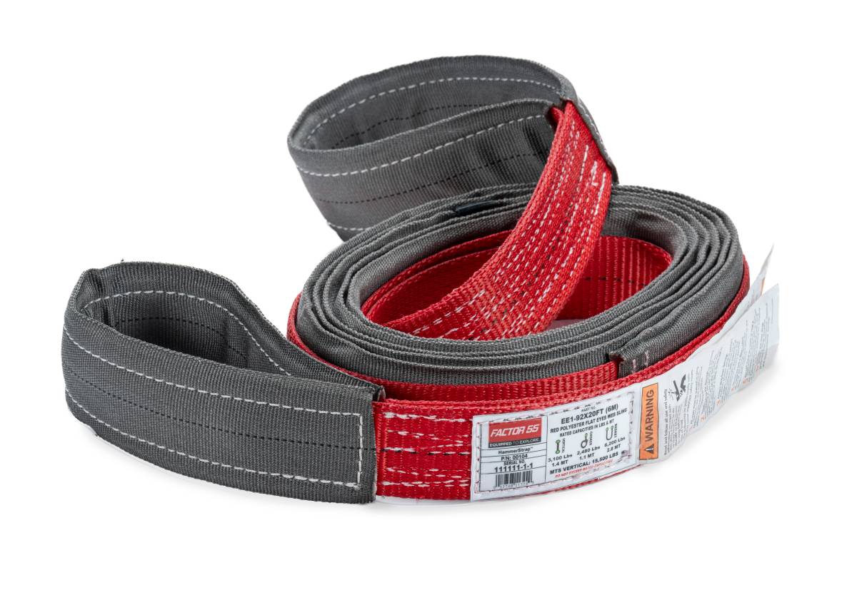 Factor 55 HammerStrapTM, a high performance 20-foot single ply anchor strap meticulously crafted for recoveries in the challenging terrain encountered during off-road racing. Engineered with the demanding needs of off-road racers in mind, this specialized rigging solution is influenced by the prestigious Hammers trails, where its reliability and effectiveness have been proven. Crafted from premium quality USA materials, The HammerStrapTM features a durable polyester single ply strap wrapped with a CORDURA ballistic fabric two-thirds the length of the strap. This innovative construction ensures exceptional strength and resilience, making it ideal for navigating rocky terrains with ease and confidence. Whether maneuvering around large boulders or other obstacles, this anchor strap is designed to withstand the harshest conditions encountered during off-road racing. One of the standout features of the HammerStrapTM is its center line visual indicator, facilitating quick and hassle-free setup. This intuitive design element enhances user convenience and ensures efficient rigging, saving valuable time during critical recovery operations.
