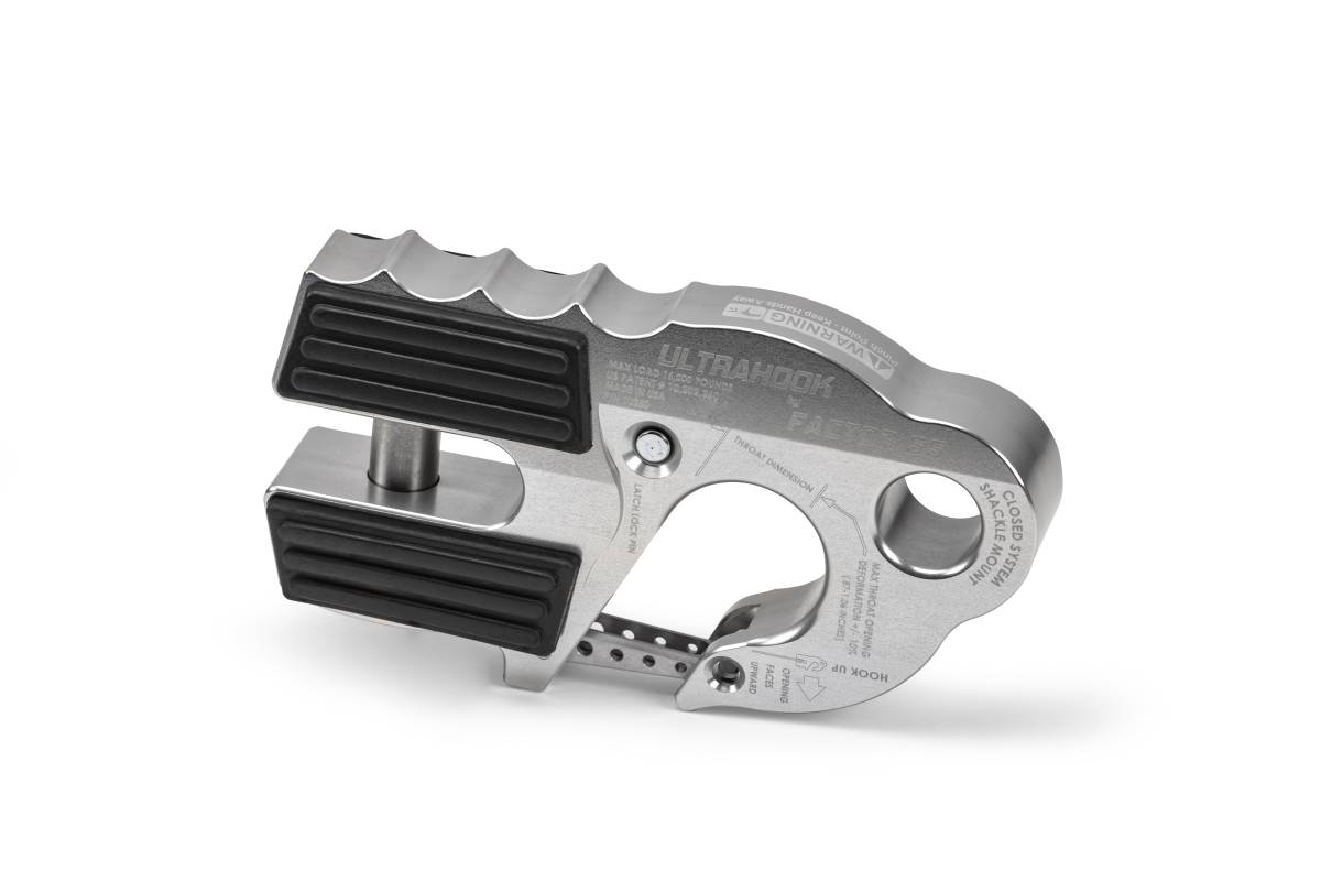 Ultrahook was developed to meet the needs of off-road racers who needed the speed of a hook and the functionality of closed system winching. Featuring industry-first closed system shackle mount hole machined into the body of the hook. The safety latch fits securely into a machined pocket and has an integrated secondary locking feature. The latch locking pin is stored in the body of the UltraHook and can be inserted into the hook tip, locking the latch into place. Featuring EPDM rubber pads for fairlead protection, titanium double shear pin, and a finger grip feature that promotes proper ?Hook-Up? orientation.