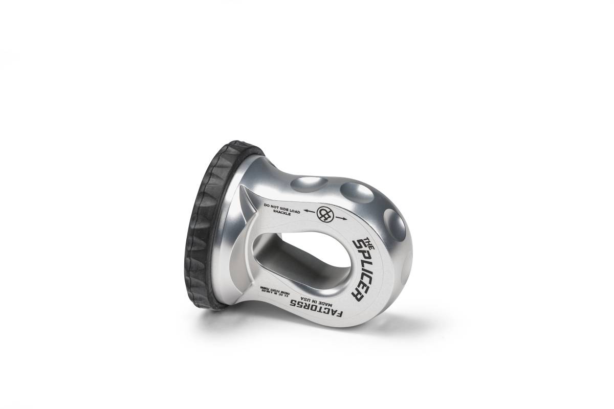 The world?s first splice on synthetic rope shackle mounting thimble with rope protection and integrated rubber pad. The unique machined rope passage provides a tough outer barrier to protect against rope impact and abrasion as well as UV exposure protection. Compatible with synthetic ropes up to 1/2" in diameter. NOTE: Unlike the Factor 55 ProLink and Flatlink shackle mount products, The Splicer requires synthetic rope splicing knowledge. We recommend either the locking Brummel Splice or Long Bury Splice. Due to the splice-on design, the Working Load Limit (WLL) is based on the rope diameter used. Each Splice-On Shackle Mount exceeds minimum bend radius requirements to provide full breaking strengths of synthetic winch lines used. Made in USA