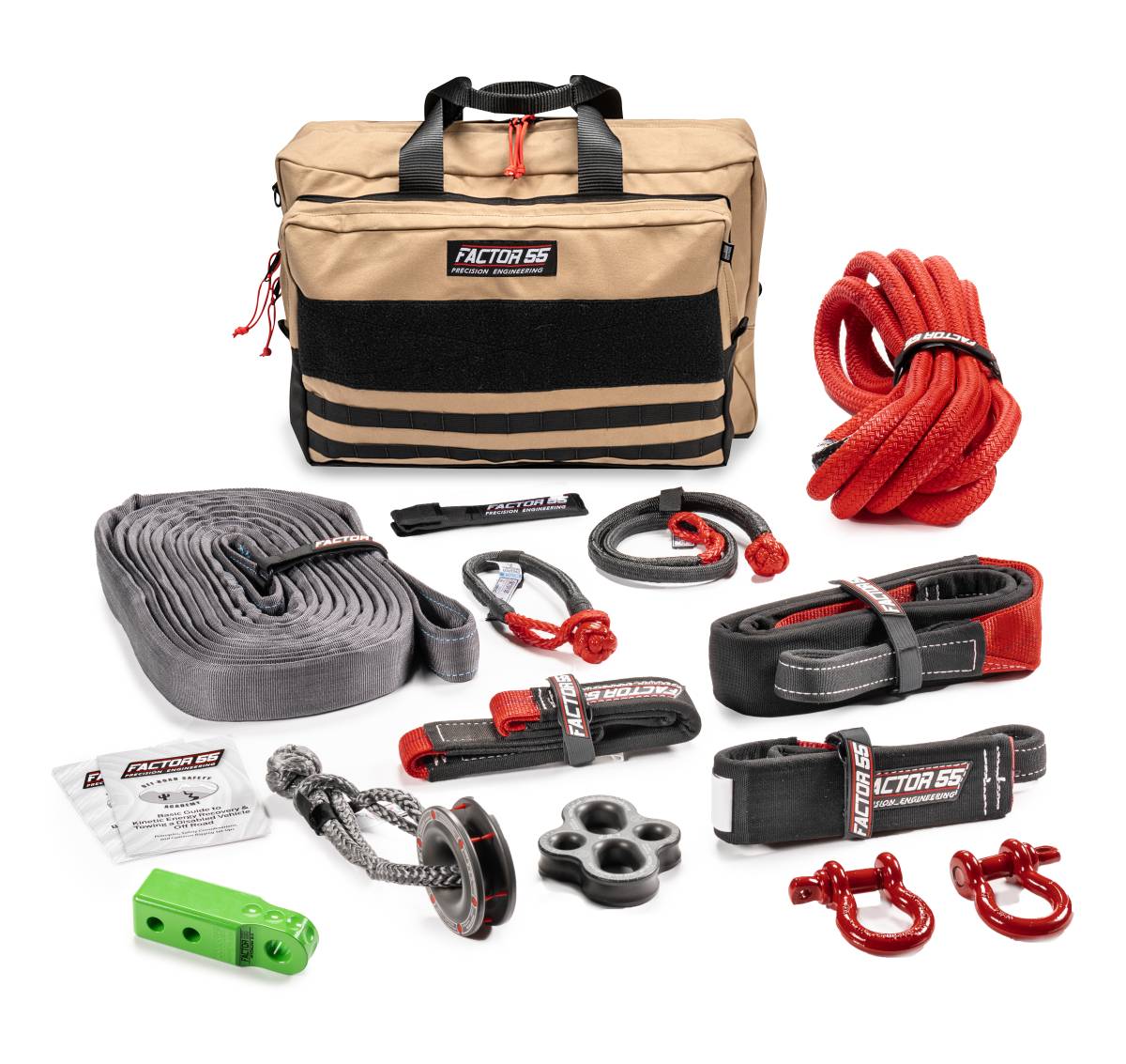 Borah Kit is our largest recovery gear kit and includes: two 3/4? Crosby Shackles, 10? Extreme Duty Soft Shackle, 10? Standard Duty Soft Shackle, 20? Extreme Duty Soft Shackle, Shorty Strap II, Tree Saver, Shorty Strap III, Extreme Duty Tow Strap, 7/8? Kinetic Rope, LDP, RRP, Fast Fid, Basic Guide to Winching, five Strap Wraps, all packed into the Large Factor 55 Recovery Bag