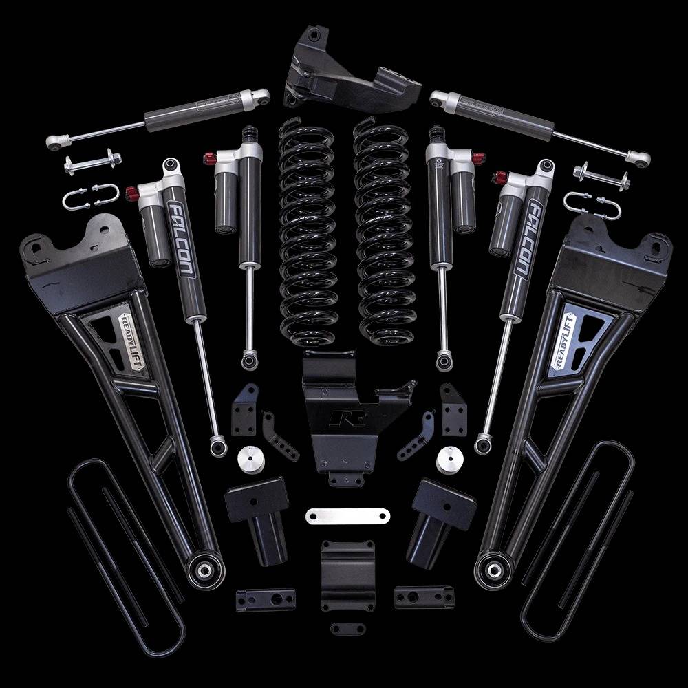 ReadyLIFT Suspension is pleased to announce a new Super Duty lift kit. We are now offering our first 4" Coil Spring Kit including Tubular Radius Arms, Falcon Dual Steering Stabilizer and the new Falcon 3.3 piggyback shocks. This gives Super Duty owners an excellent alternative for lifting their trucks to fit larger tires. The coil spring system allows for increased tire sizes and widths along with providing improved ground clearance on a head-turning stance! This optimum lift height allows for up to 37" tall tires. The coil spring kit delivers a great ride and handling performance! The key ingredients to improving Super Duty ride and handling are the new, specially engineered coil springs teamed with Falcon 3.3 shocks and a track bar relocation bracket! Features & Benefits: 4" Coil Spring Lift Kit with Vehicle-specific performance-tuned Falcon Shocks. Tubular Radius Arms help to correct the caster angle in Falcon Dual Steering Stabilizer Bolt-on lift kit - no structural modifications required. Allows for up to 37" tall tires on 9" wide wheels with +18 offset. Diesel trucks with rear single-wheel only. Falcon 3.3 monotube dampers on all four corners. 3.3 Fast Adjust Dampers offer a wide range of adjustability for specific terrain and/or handling characteristics with two separate knobs to tune to your preference. 3-Position Fast Adjust Knob for Soft, Custom, and Firm Compression. Soft mode allows a partial bypass of the main piston for a softer ride 8-Position Micro Adjust Dial offers refined damping adjustments Reservoir design increases nitrogen to oil ratio for consistent damping over wide temperature ranges. NOTE: Tremor versions will not gain the full 4 inches over stock ride height. Kits are designed for diesel applications only. Not recommended for 2WD or gas trucks. Single Cab configuration has not been validated for fitment & drivability by ReadyLIFT.