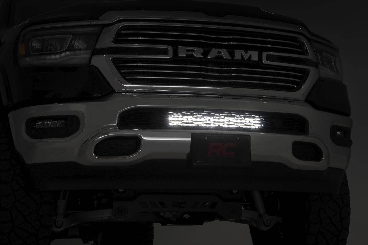 COMMAND THE DARK: Add LED illumination to the front of your 2019 RAM 1500 with Rough Country's 20in Hidden Bumper LED. This sleek, discreet lighting system blends in seamlessly with the front-end design, hidden behind the mesh grille on the factory front bumper. This powerful LED application provides 120 watts of forward-facing illumination in a convenient 8 degree spot / 90 degree flood combo pattern for maximum viewability. Each Rough Country LED light features an IP67 waterproof rated durable diecast aluminum housing for a long lifespan or great performance. Each light features a premium wiring harness with in-line fuse for easy operation. Choose from Rough Country's Black Series and DRL Series Light Bars.