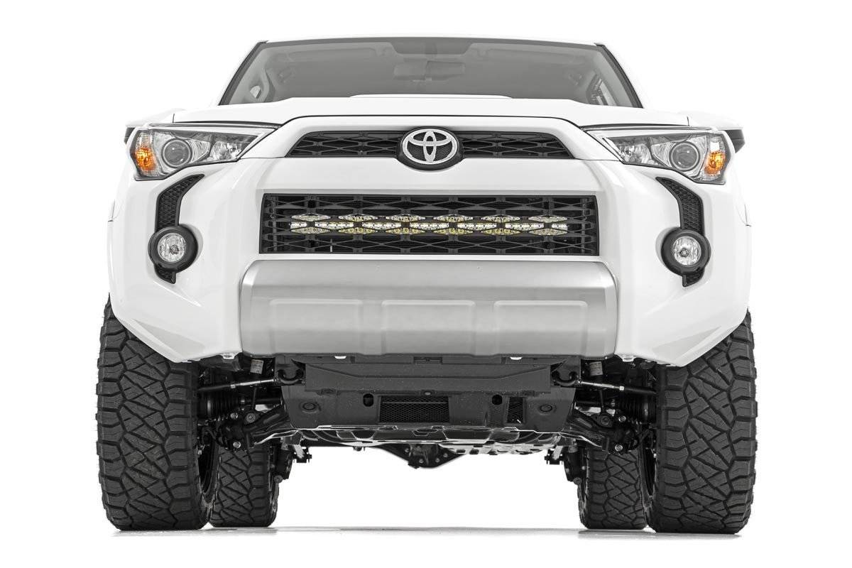COMMAND THE DARK: Add LED illumination to the front of your Toyota 4-Runner with Rough Country's 30in Hidden Grille LED. This sleek, discreet lighting system blends in seamlessly with the front-end design, hidden behind the mesh grille on the factory front grille. This powerful LED application provides 300 watts of forward-facing illumination in a convenient 8 degree spot / 90 degree flood combo pattern for maximum viewability. Each Rough Country LED light features an IP67 waterproof rated durable diecast aluminum housing for a long lifespan or great performance. Each light features a premium wiring harness with in-line fuse for easy operation. Choose from Rough Country's Black Series and DRL Series Light Bars.