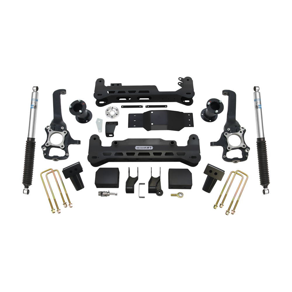 The ReadyLIFT 7" Complete Lift Kit System is specifically designed for 2015-2020 Ford F-150 4WD trucks, offering maximum lift while maintaining factory ride and steering geometry. This premium kit includes a 7.0" front and 5.0" rear lift for rugged off-road strength and on-road comfort. It features precision-designed subframe assemblies that bolt in directly, with minimal welding required. The kit includes heavy-duty cast nodular iron steering knuckles, a patent-pending rack-and-pinion steering drop correction system, and an integrated differential drop bracket system to ensure proper CV axle angles and 4WD performance. One notable feature is the patent-pending fabricated offset steel strut extensions, providing a maximum 7" front lift, while OEM-style rear blocks (total rear lift of 4.0" when installed) maintain ride quality. The kit also includes a steering extension to preserve steering performance, eliminating the need to cut or replace tie rod ends. This no-weld design ensures easy bolt-on installation. Furthermore, the kit incorporates a patent-pending Rack Correction System (RCS) to work with the relocated steering rack, maintaining stock steering geometry. This prevents issues down the road, as cutting tie rods can lead to alignment problems when replacing tie rods with OE replacements. The dropped rack and pinion system allows the truck to retain OEM alignment specs, a stock turning radius, and the stock track width. It even uses factory-style cam plates and can be aligned to factory specifications. The ReadyLIFT 7" Complete Lift Kit System is compatible with stock wheels or most 17" or larger aftermarket wheels with a wheel width of up to 9" and a backspacing of 4.75" - 5.5". Note that this kit is designed for vehicles with a 1-piece driveshaft; for trucks with a 2-piece driveshaft, an alternative rear upgrade solution is available by contacting 877-759-9991.