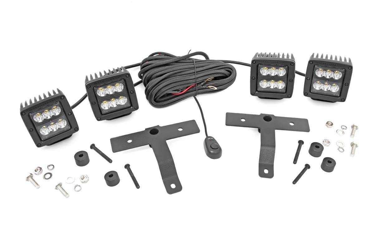 COMMAND THE DARK with Rough Country's Quad LED Light Pod Kit! This all-inclusive kit comes with everything you need to mount two pairs of LED cubes on your Jeep's cowl with an easy-to-install design that goes on lightning fast! Gain an incredible 5,760 lumens and 72 watts of combined lighting power with an easy 100% bolt-on installation process that will have you up and running in no-time flat! No cutting, no drilling, just bolt them up and instantly gain a powerful output of off-road illumination so you can always see the trail ahead. Each mount holds two LED light pods with a postionable base that lets you choose if you want them forward-facing or pitched outward for a wider area of coverage. Rough Country LED light cubes are IP67 Waterproof and includes a premium, braided wiring harness with in-line fuse and on/off switch.