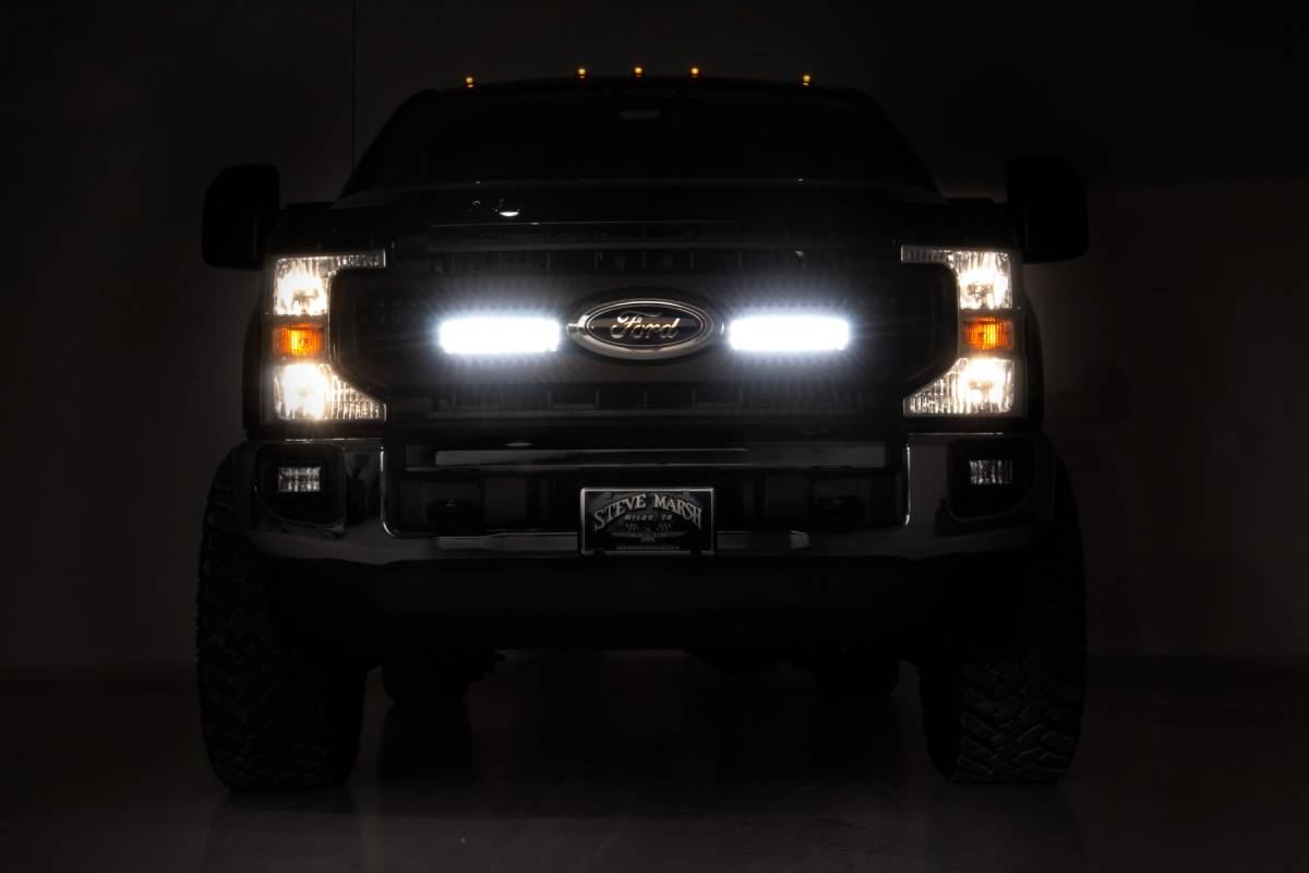 You should never have limited visibility when taking to the road less traveled. Here at Rough Country we keep the adventurist in mind and have created a clean solution for the front of your F-250 that fits in so well with the front-end aesthetic that people may ask you if it was a factory option. Introducing Rough Country's 10" Slimline Grille Kit! This innovative kit includes four of Rough Country's 10" Black-series LED Light Bars for the exact look you desire. With a combined 16,000 lumens and 200 watts, this simple kit offers you massive LED output, in the perfect, front-facing position to light up the path ahead. Each light features an IP67 waterproof design in a durable die-cast aluminum housing for unparalleled protection from water, dust, and debris. This kit includes a premium, flat-wound wiring harness with an on/off switch or can be wired directly into your factory Ford up fitter switch. Includes a 3-year LED warranty and lifetime mount warranty.